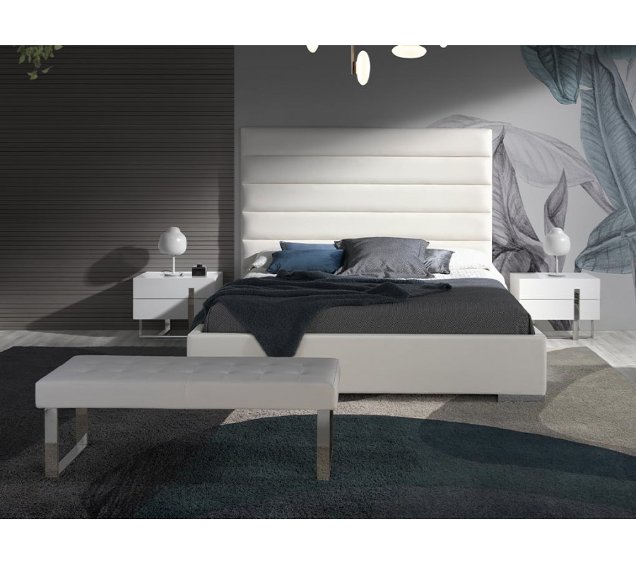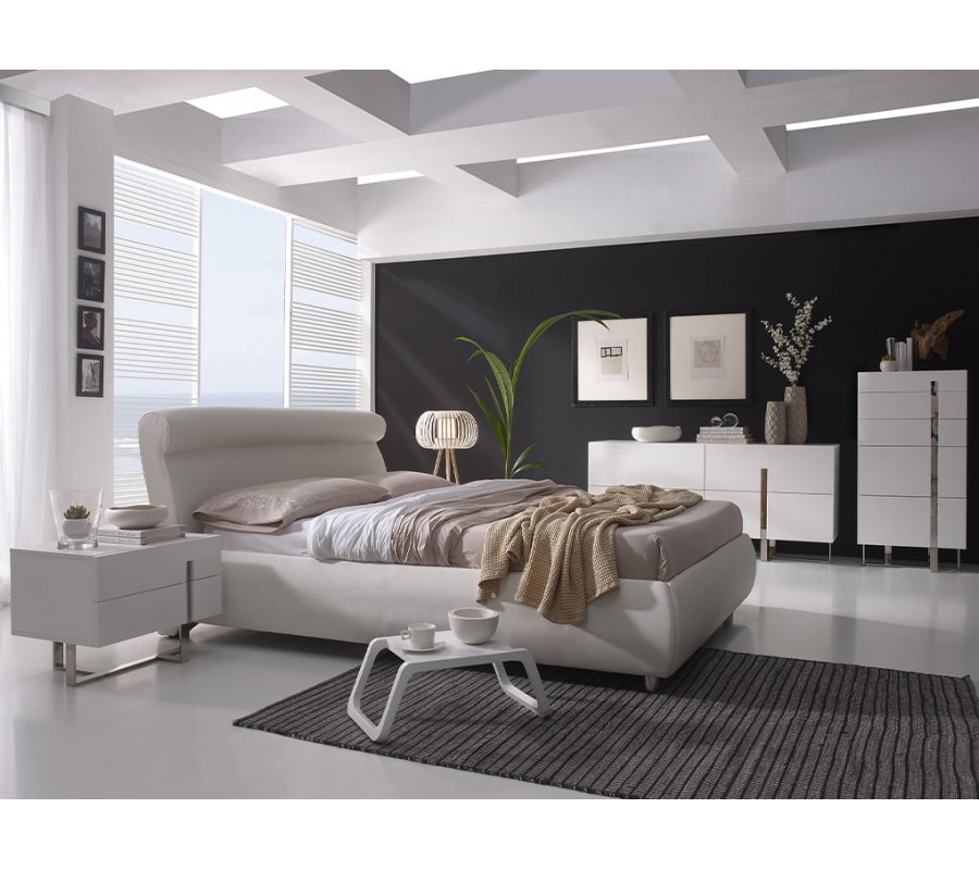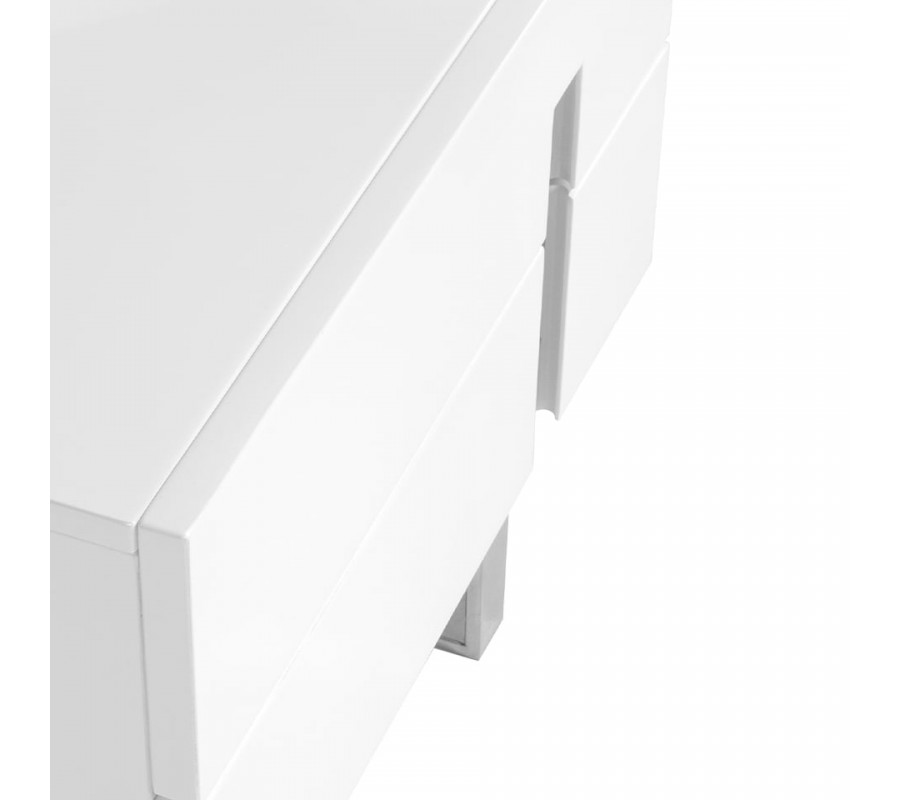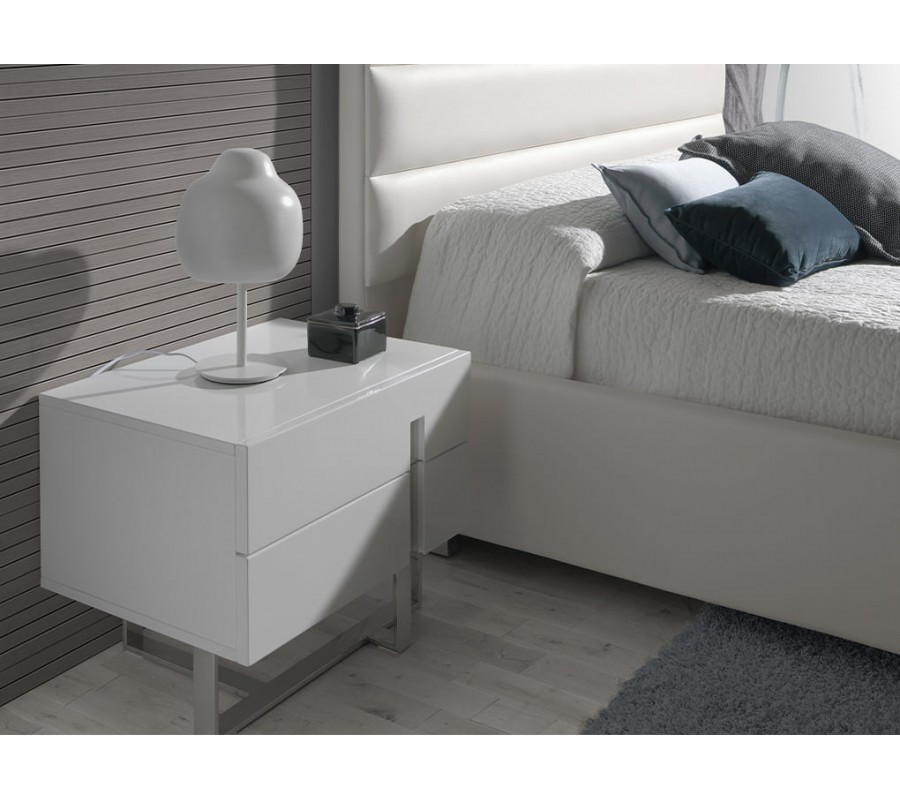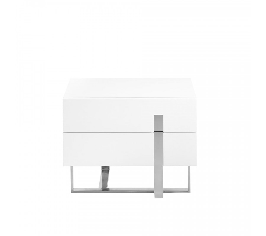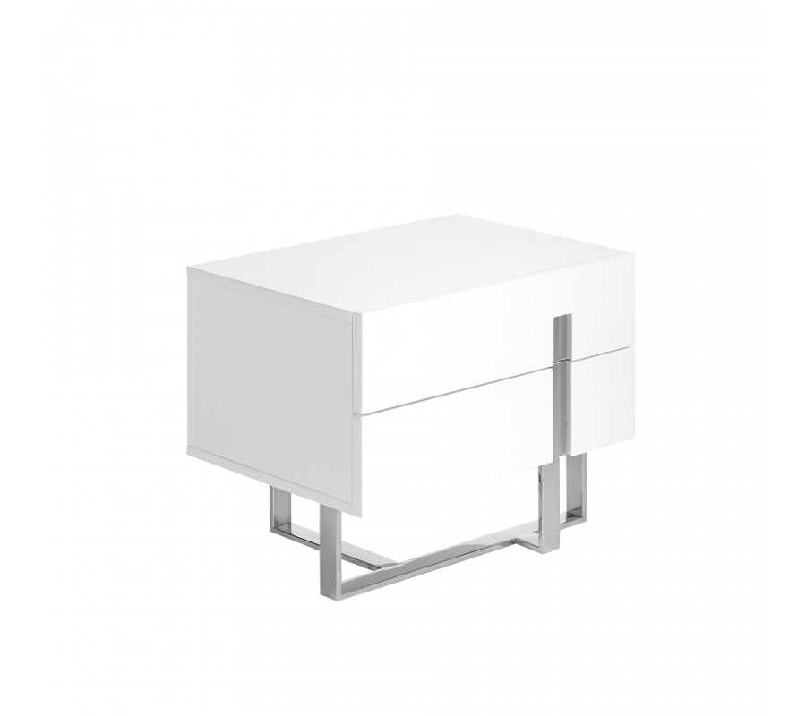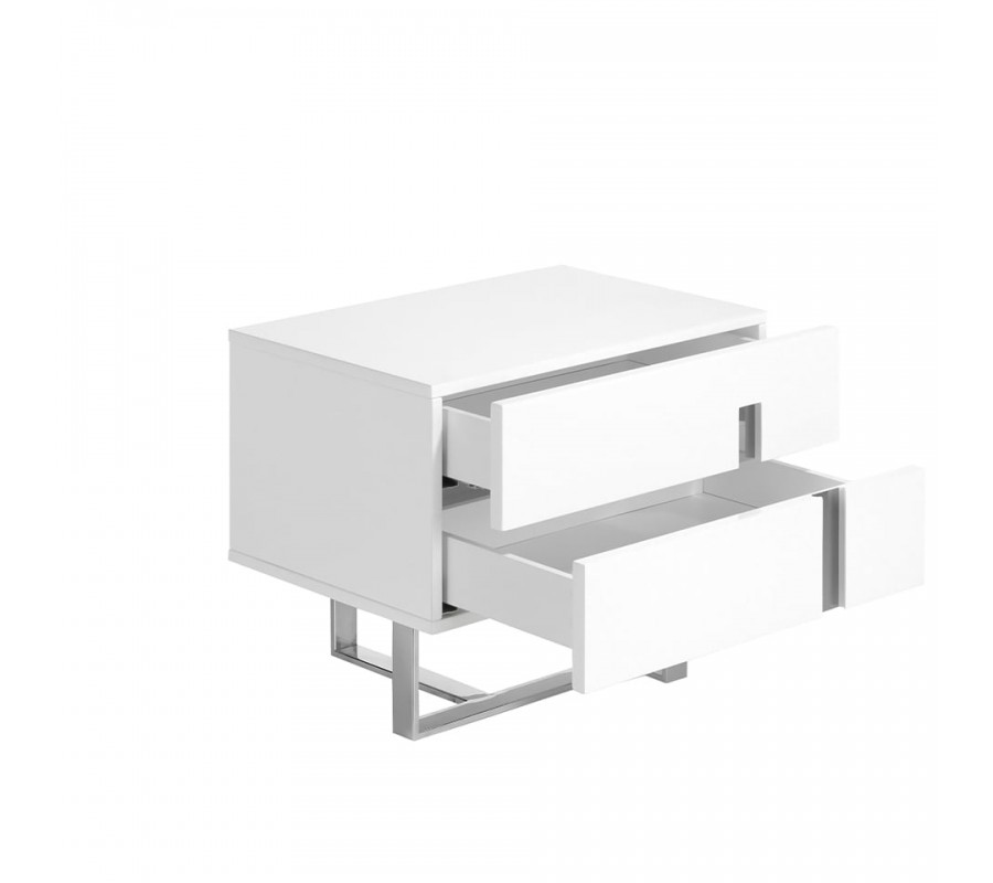 Dizajnový nočný stolík Forma Moderna je vyrobený z lesklého, bieleho, lakovaného dreva, ktorého minimalistický a elegantný vzhľad je podčiarknutý originálnou konštrukciou nôh z chrómovanej nehrdzavejúcej ocele. Inteligentné prevedenie a nevšedný tvar chrómových nožičiek dodá stolíku Forma Moderna nádych avantgardného štýlu, ktorý umocňuje jeho luxusný vzhľad v modernom štýle. Zaujímavým dizajnovým prvkom je aj vyrezávanie na praktických zásuvkách s chrómovým detailom, ktorý oživí minimalistické prevedenie stolíka.