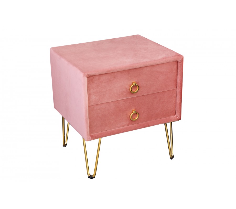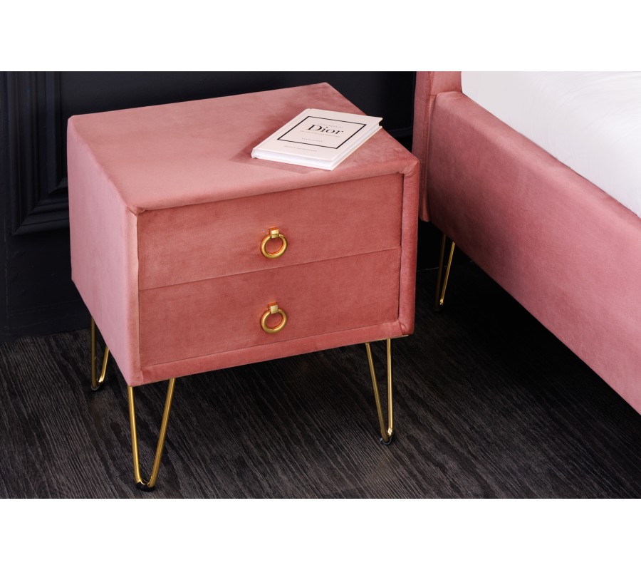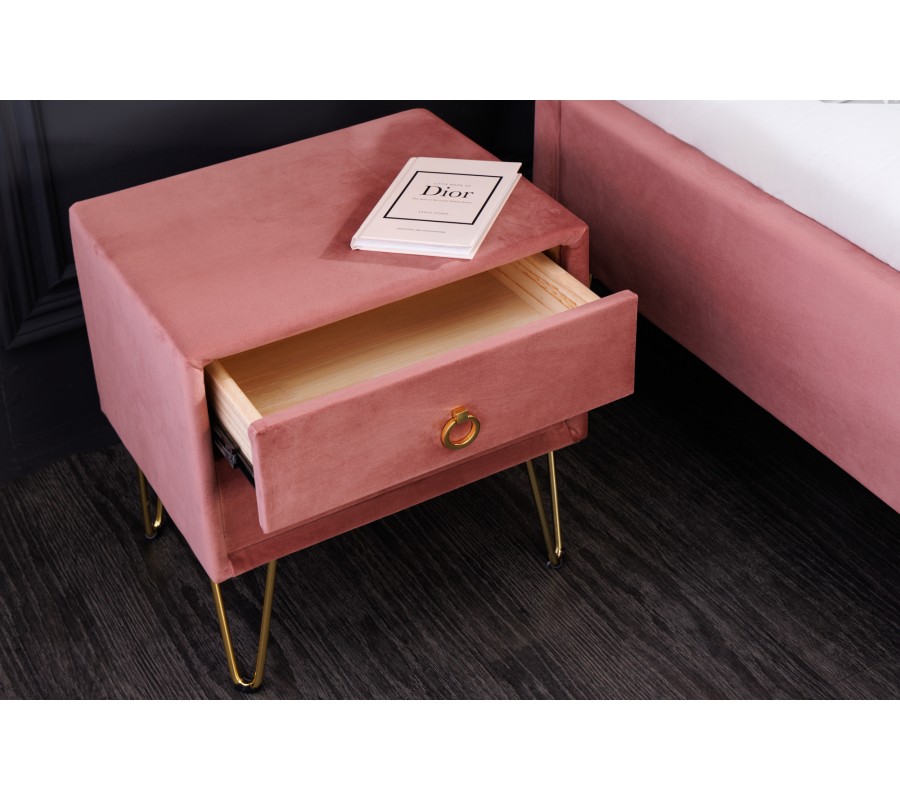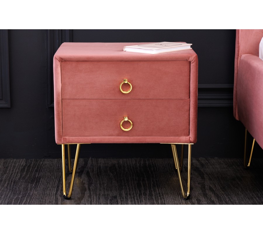 Art deco dizajnový nočný stolík Bentley s ružovým zamatovým poťahom a zlatými nožičkami z kovu 49cm