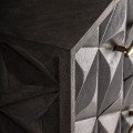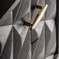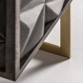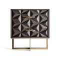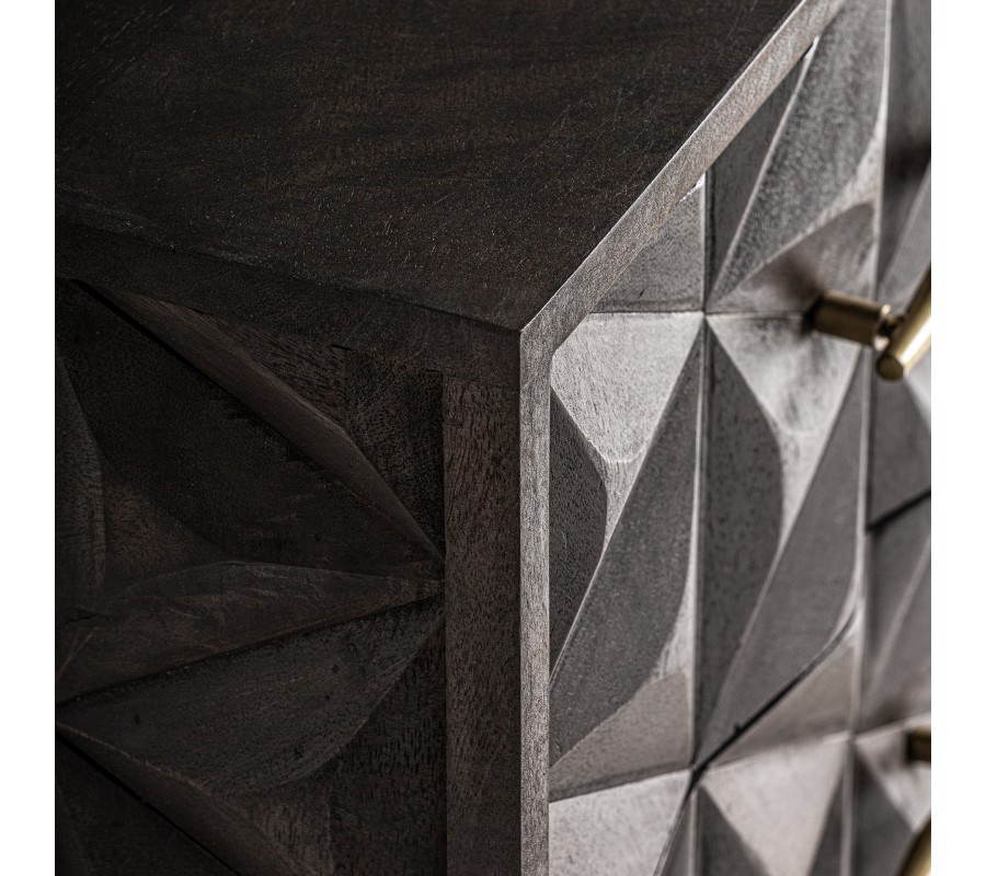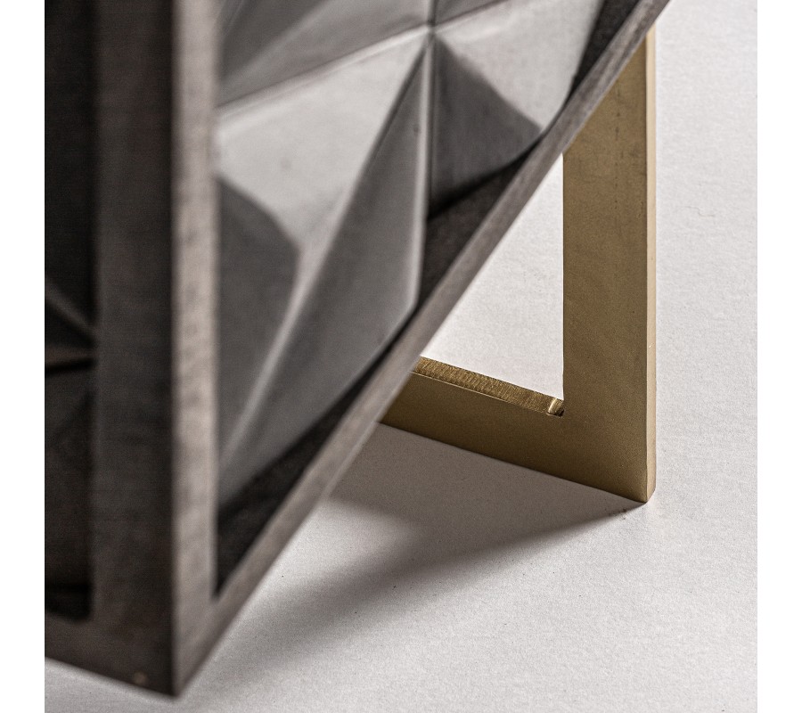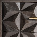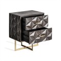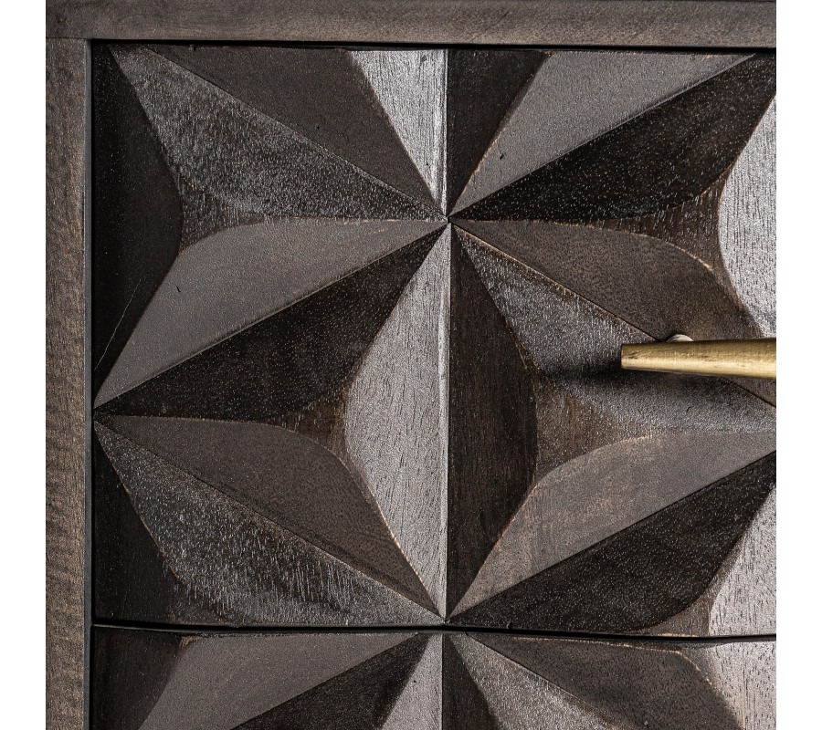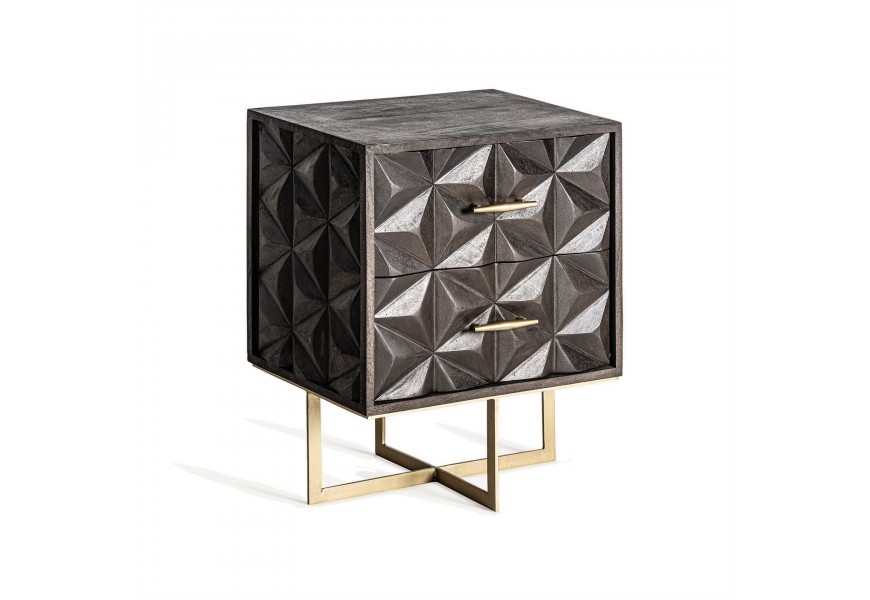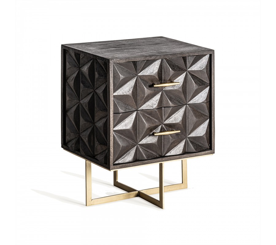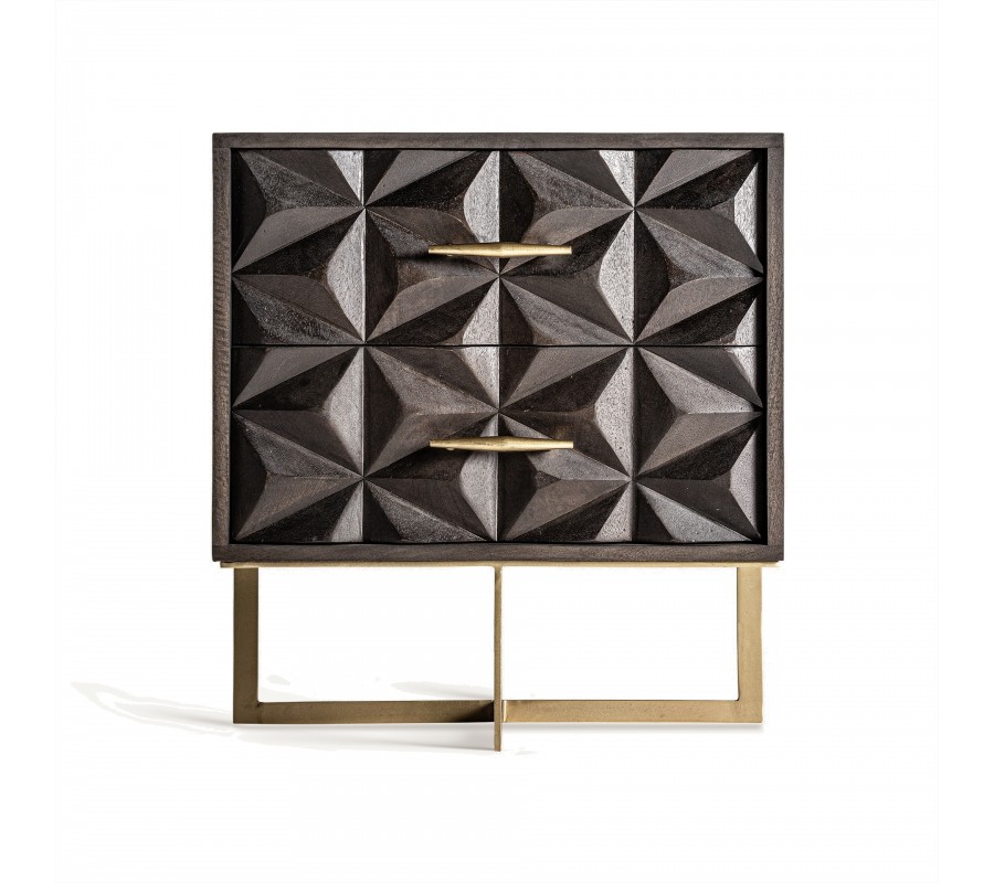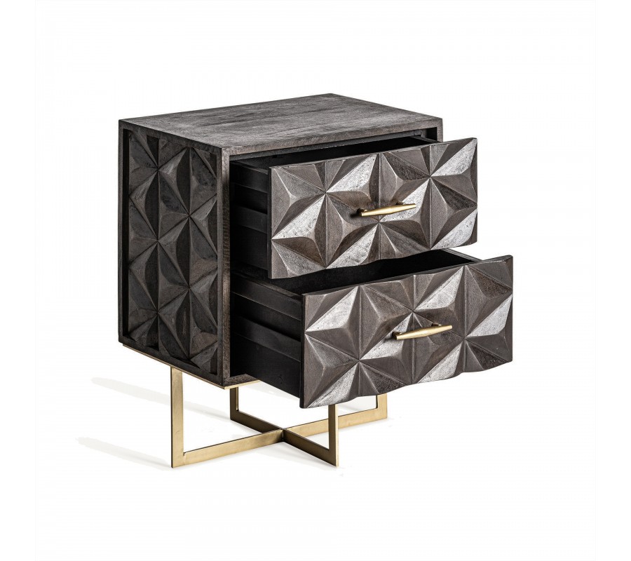 Luxusný nočný stolík Oxalis bude klenotom vašej spálne. Dizajnu dominuje vyrezávané reliéfne zdobenie zložené z trojuholníkových prvkov, ktoré sa spájajú v modernej plastickej kompozícii pripomínajúcej diamantový vzor. Vrchná doska je hladká a vyniká na nej prírodná štruktúra dreva. Nočný stolík je vyhotovenýv v tmavej čokoládovej hnedej farbe, ktorá ešte zvýrazňuje trojrozmerné detaily výzdoby. Vytvára tiež estetický kontras s kovovými úchytkami a nožičkami v zlatej farbe, ktorá dodáva stolíku honosný vzhľad. Zaujímavým vizuálnym prvkom je podstava v tvare kríža, ktorá spája nožičky a zároveň zaručuje stabilitu nábytku. Nočný stolík vám poskytuje okrem odkladacieho priestoru na vrchnej doske aj uzavretý úložný priestor v podobe dvoch zásuviek. Je vyrobený z masívneho mangového dreva, ktoré je ručne opracované, čo zaručuje unikátnosť každého kusu. Skvele doplní posteľ s prešívaným čalúnením, ktoré sa vizuálne prepojí s reliéfnym povrchom. Môžete tiež pridať nočné svetlo so zlatou podstavou v art deco alebo glamour štýle.