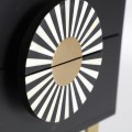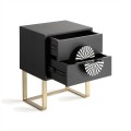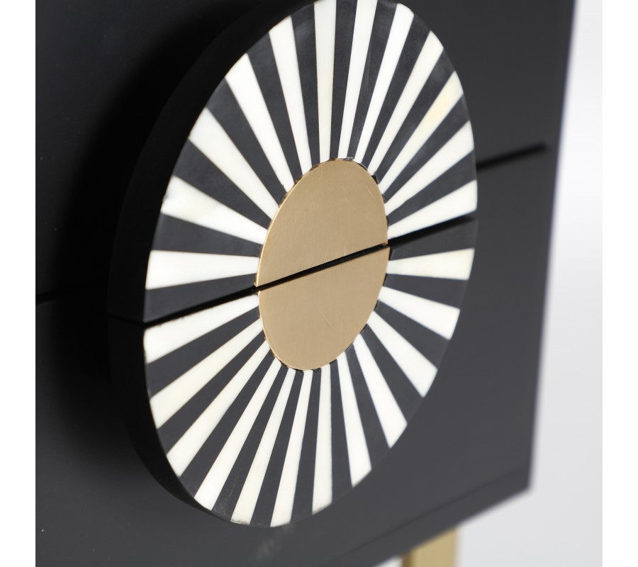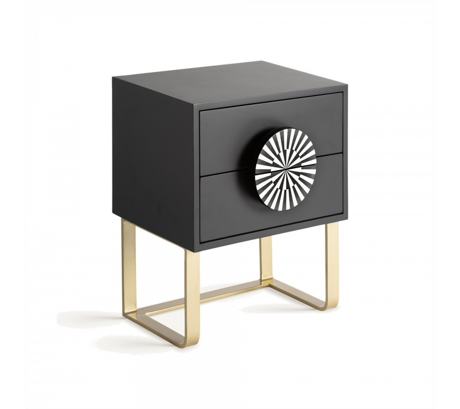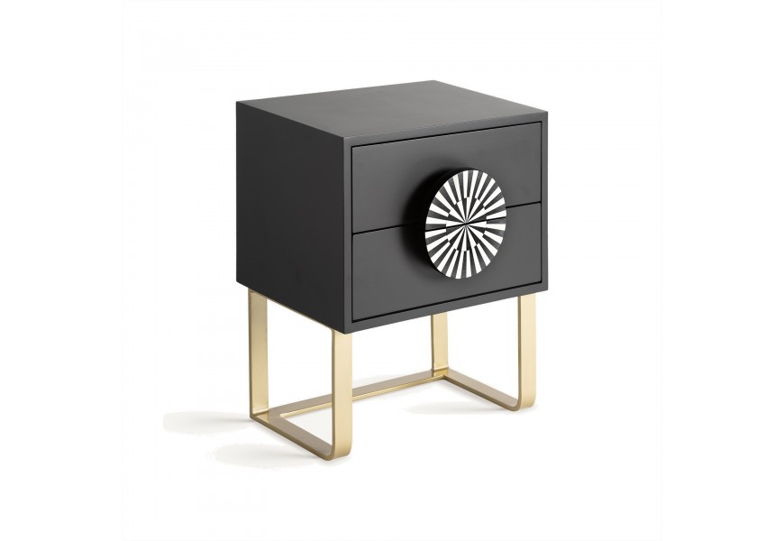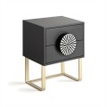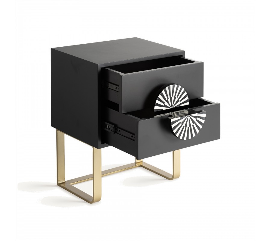 Luxusný nočný stolík Tesoreria je žiarivým príkladom moderného nábytku inšpirovaného estetikou 20. rokov minulého storočia. Je vyrobený z masívneho dreva v sofistikovanej čiernej farbe. Povestný lesk art deco éry mu dodávajú tenké nožičky z kovu v zlatej farbe, ktoré sú prepojené podstavou otvorenou na prednej strane. Predné nožičky na s ňou spájajú v elegantnej krivke, ktorá korešponduje s úchytkami na otváranie zásuviek. Každá zásuvka sa otvára pomocou polkruhu, ktoré sa vizuálne spájajú a vytvárajú na prednej dominantný dizajnový kruhový prvok. Je ozdobený kontrastnou kosťovou inkrustáciou v čiernej a bielej farbe s motívom slnečných lúčov vychádzajúcich z jeho centra. Stolík vám poskytuje uzavretý úložný priestor v dvoch zásuvkách a otvorený na vrchnej doske. Je skvelou voľbou do monochromaticky zariadených spální, kde vnesie nádych luxusu. Stolík môžete tiež doplniť k ďalšiemu art-deco nábytku so zlatými kovovými prvkami. Ak máte radi extravaganciu a glamour, môžete stolík skombinovať s opulentnou posteľou s farebným zamatovým čalúnením a lesklými doplnkami. K posteli tiež môžete umiestniť nočné svetlo kovovou zlatou podstavou či s výrazným čiernobielym vzorom.