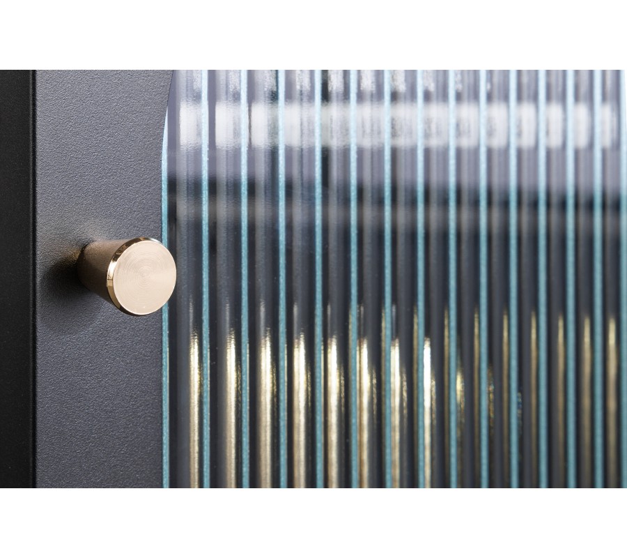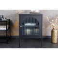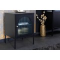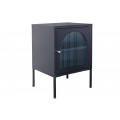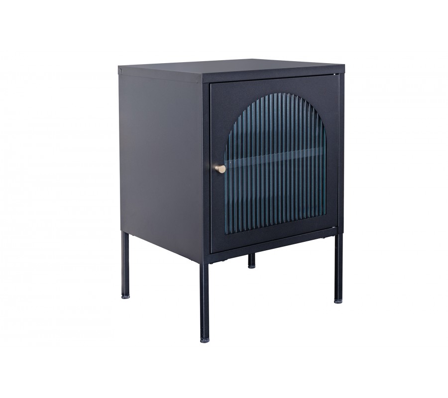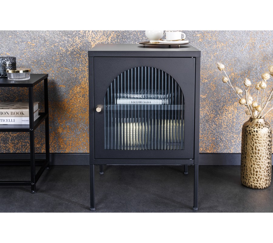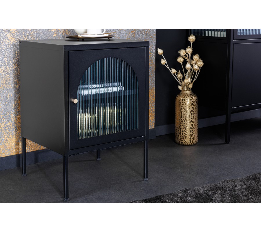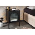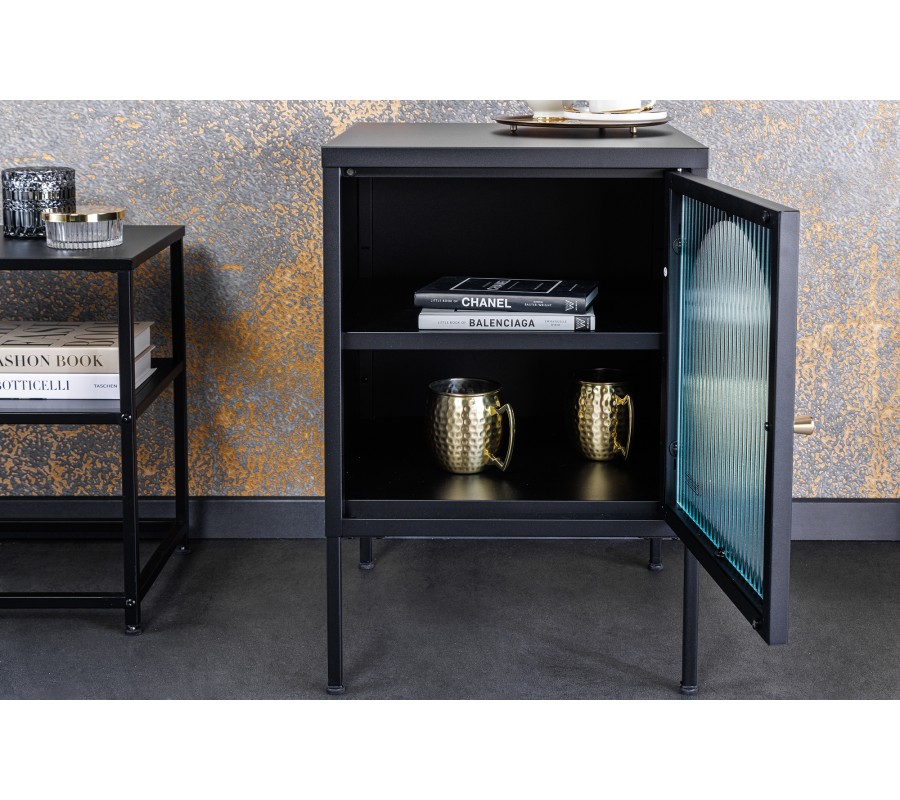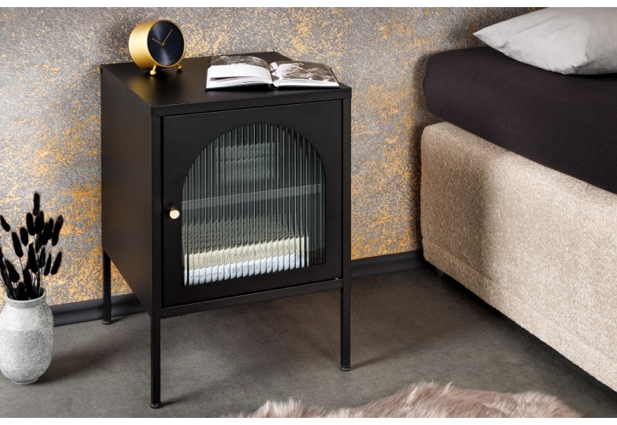 Industriálny nočný stolík z kolekcie Industria Durante je jedinečným kúskom pre vašu spálňu. Jeho dizajn kombinuje kovové prvky v čiernej farbe s bezpečnostným vrúbkovaným sklom, ktoré je takmer nepriehľadné, čím umožňuje diskrétne uloženie vašich vecí v stolíku. Stolík je osadený na tenkých, kovových nožičkách, čo dodáva jeho vzhľadu ľahkosť a moderný industriálny štýl. Stolík obsahuje jednu poličku s dvierkami, ktoré sa otvárajú na magnet.