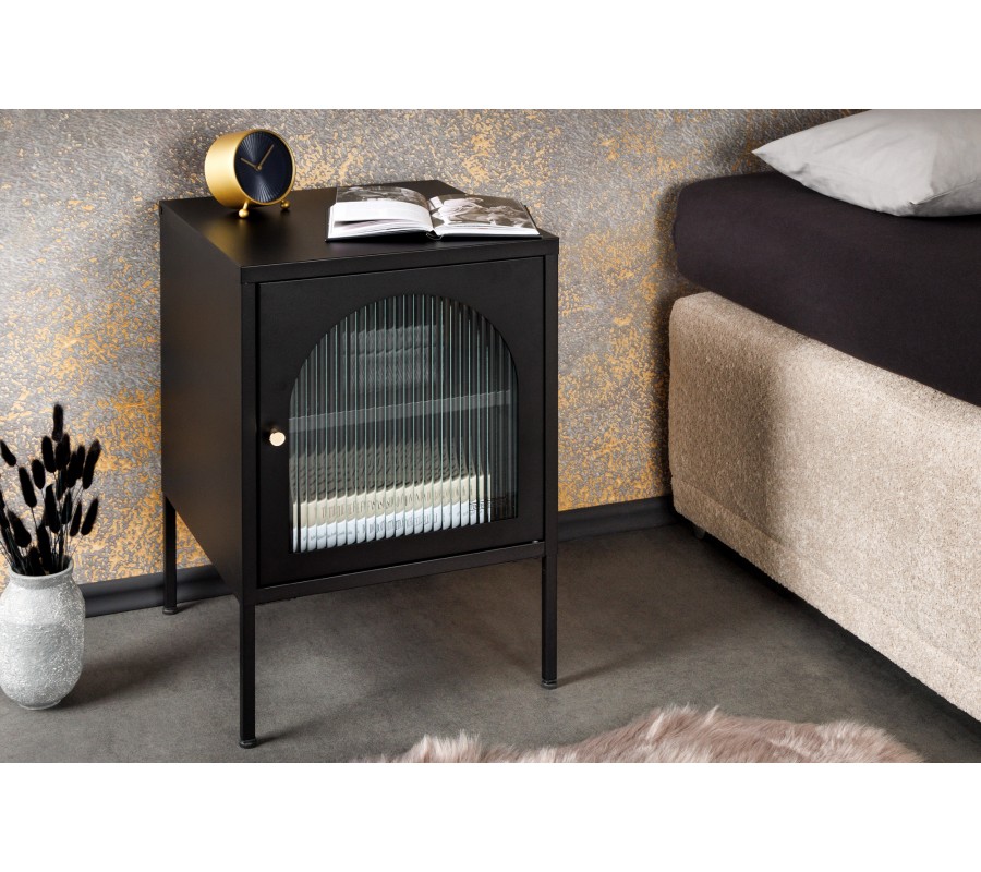 Nočný stolík sa hodí v spálni doplniť aj iným industriálne ladeným nábytkom, ktorý má konštrukciu z čierneho kovu ale nestratí sa ani ako solitér v obyvácej izbe ako príručný stolík pri vašej sedačke. Oblúkové tvarovanie hornej časti presklenej výplne dvierok dáva klasický nádych, čo je možné využiť pri umiestnení stolíka v spálni ,v ktorej dominujú oblúkové tvary či už vo forme ozdobnej klemby alebo sú v nej oblúkové okná resp. oblúkové zrkadlá či iný nábytok s oblúkovou výzdobou .Jeho moderný a industriálny štýl bude skvelým doplnkom k ostatnému nábytku v miestnosti a prinesie do nej osobitý a atraktívny vzhľad.