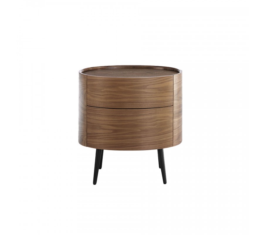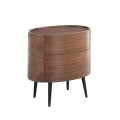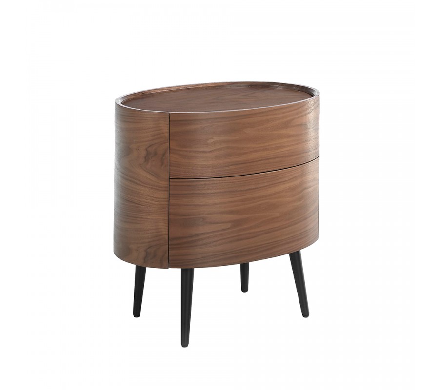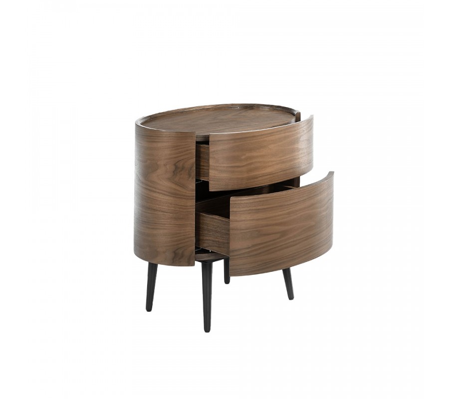 V prvom rade vás upúta originálna oválna silueta so zošikmenými nožičkami. Tvar je minimalistický, s hladkými povrchmi, ktoré dávajú priestor vyniknúť kráse orechového dreva. Zásuvky majú zaoblenú prednú stranu bez úchytiek, čo podporuje čistý moderný dizajn. Vrchná zásuvka je nižšia, ideálna na uloženie drobností, ktoré potrebujete mať v dosahu, zatiaľ čo vyššia spodná zásuvka umožňuje uskladnenie väčších predmetov. Praktickým detailom sú aj vyvýšené okraje vrchnej dosky.