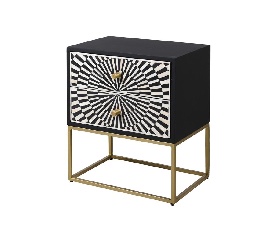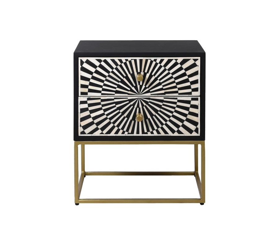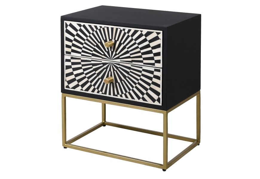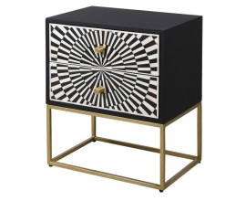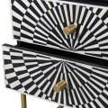 Luxusný art deco nočný stolík Siciliano so zlatým rámom s dvomi zásuvkami s čiernobielym vzorovaním z kosti a živice 61 cm