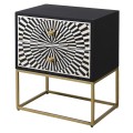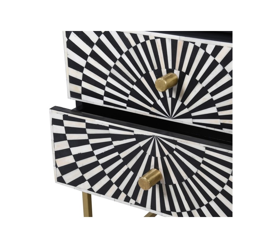 Vzorovanie na zásuvkách je tvorené optickým motívom lúčov, ktoré vychádzajú zo stredu a vytvárajú hypnotický efekt. Detail je vyrobený z kombinácie prírodnej kosti a živice, čo dodáva stolíku jedinečný vzhľad a luxusný charakter. Stolík obsahuje dve zásuvky, každú vybavenú zlatými guľatými úchytkami, ktoré podčiarkujú eleganciu a dopĺňajú zlaté kovové nožičky.