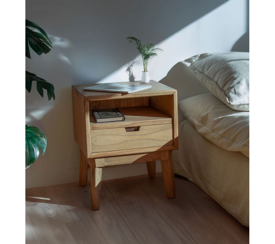 Škandinávsky dizajnový nočný stolík Bergen, vyrobený z masívneho dreva mindi, prináša do interiéru prirodzenú krásu dreva s jemnou kresbou a teplým svetlohnedým odtieňom. Drevo mindi je obľúbené v nábytkárstve vďaka svojim vynikajúcim odolným a pevným vlastnostiam. Minimalistický dizajn v škandinávskom štýle kombinuje jednoduché línie a funkčnosť.