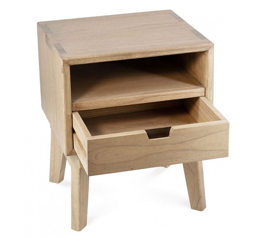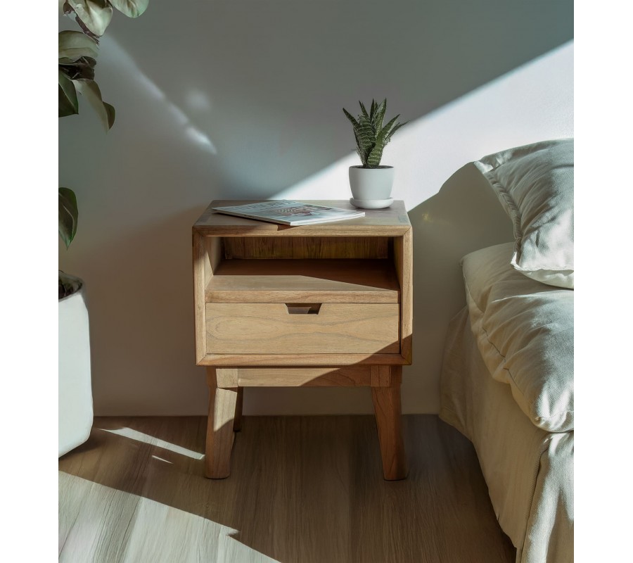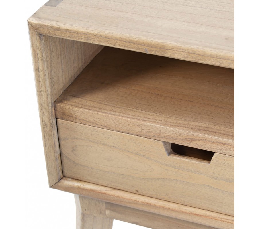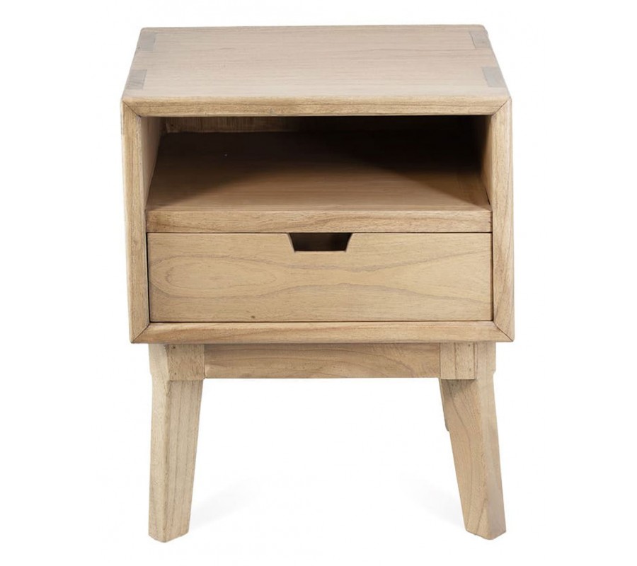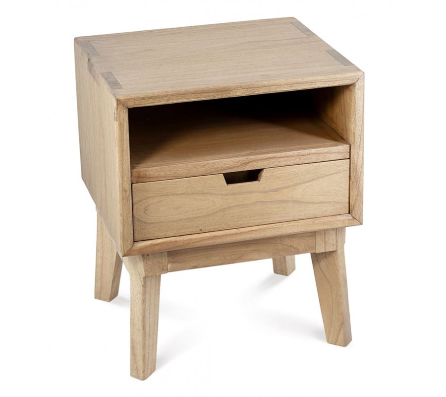 Škandinávsky masívny nočný stolík Bergen hnedej farby z dreva mindi s jednou zásuvkou a otvorenou policou 55 cm