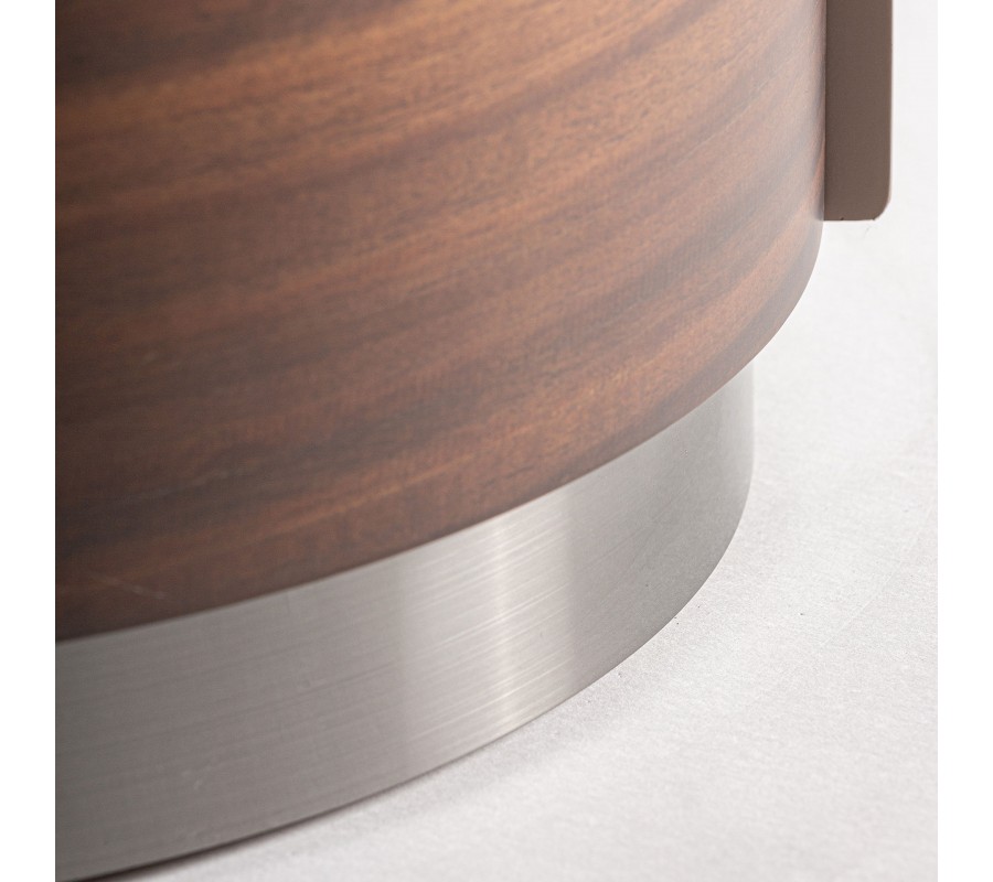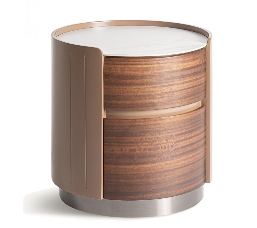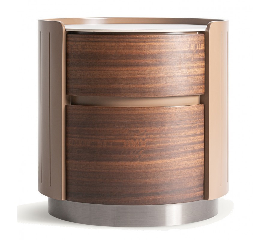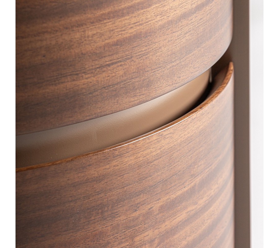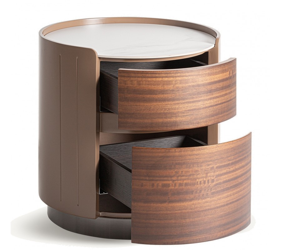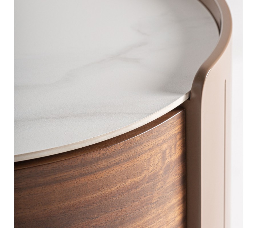Nočný stolík má atypický okrúhly tvar. Obsahuje úložný priestor v podobe dvoch zásuviek bez úchytiek, vďaka čomu pôsobí uhladeným a moderným dojmom. Vrchná zásuvka je nižšia, ideálna na dôležité drobnosti, zatiaľ čo vyššia spodná zásuvka zasa poskytuje priestor aj na väčšie predmety. V spodnej časti sa nachádza okrúhla podstava s menším priemerom. Okraje vrchnej dosky sú vyvýšené, s výnimkou prednej strany nad zásuvkami.