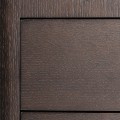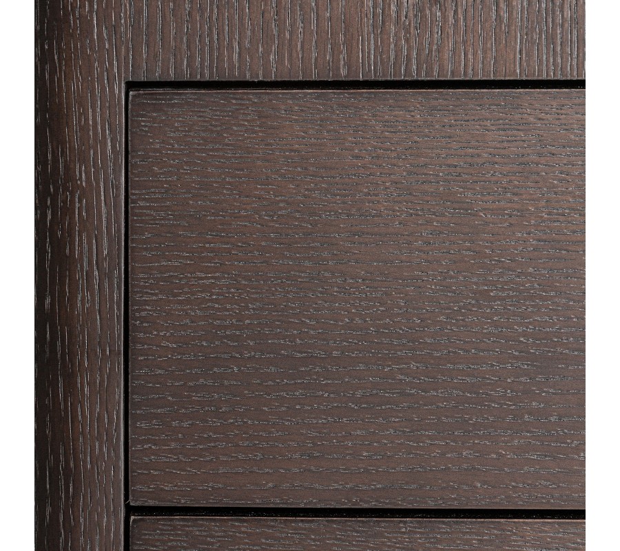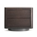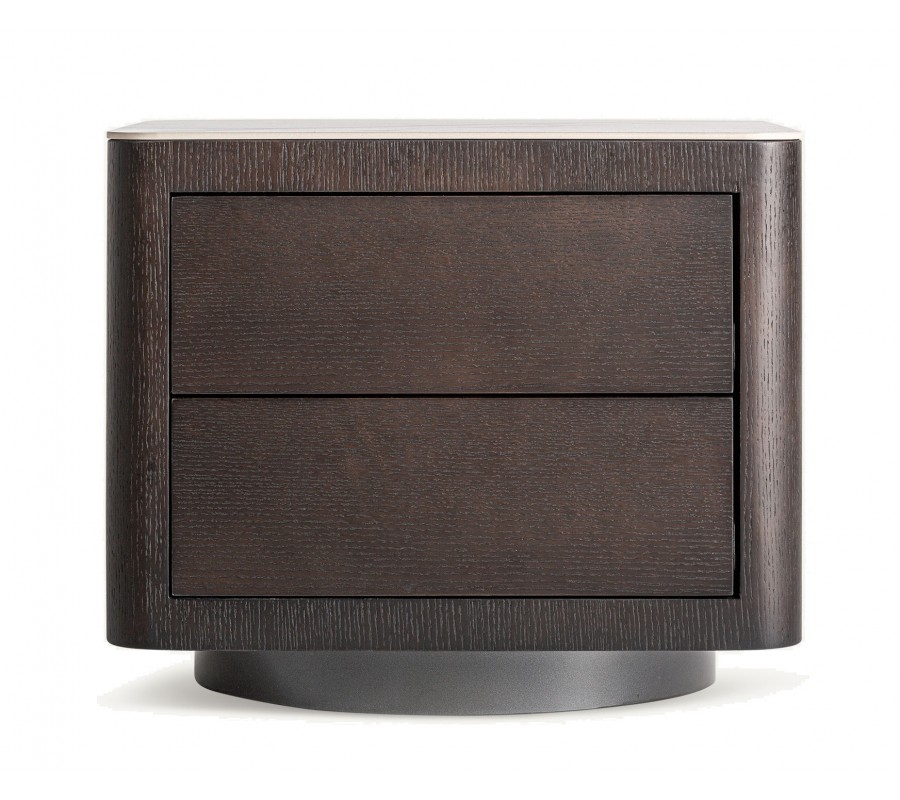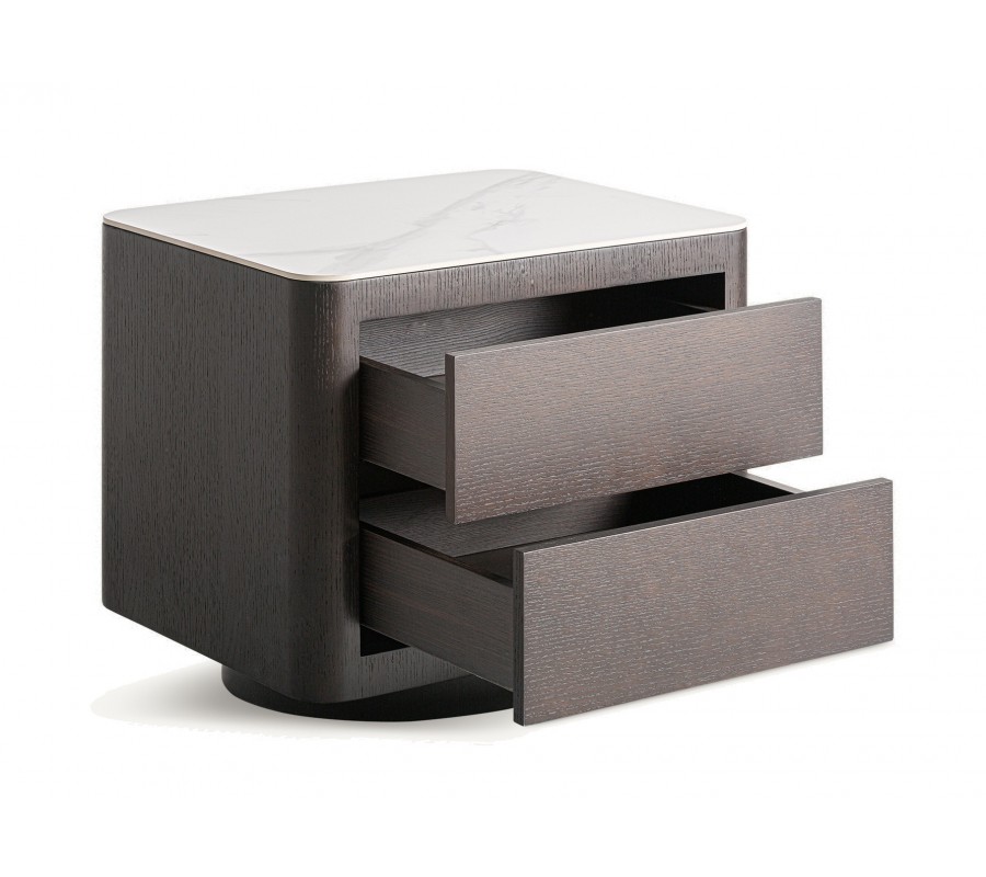 Nočný stolík má obdĺžnikový tvar s výrazne zaoblenými vertikálnymi hranami. Telo stolíka je vyrobené z dyhovaného orechového dreva v bohatej tmavohnedej farbe. Povrch zachováva prirodzené štruktúry dreva, ktoré oživujú minimalistický vizuál. Letokruhy sú po obvode nábytku organizované v zvislom smerovaní a na zásvkách v horizontálnom.