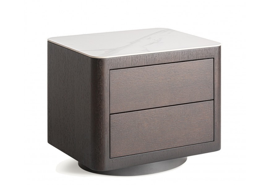 Luxusný moderný nočný stolík Hollis s dvomi zásuvkami v tmavej hnedej farbe s bielou mramorovou doskou 55 cm