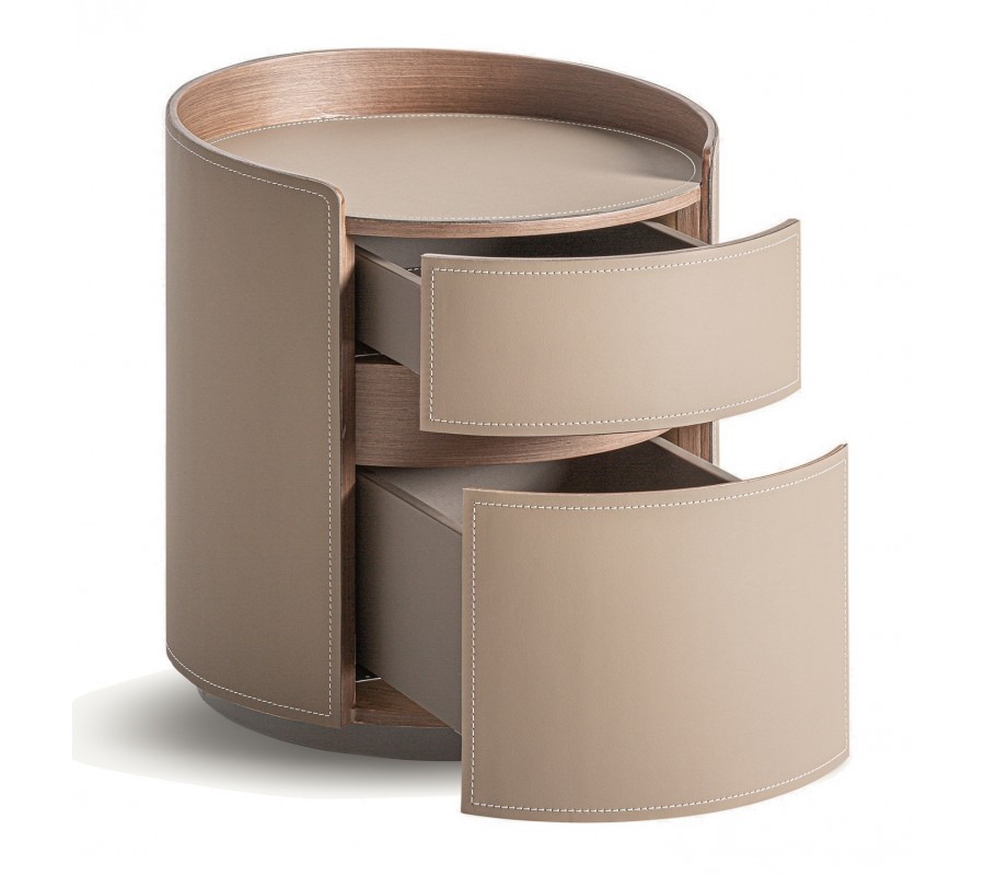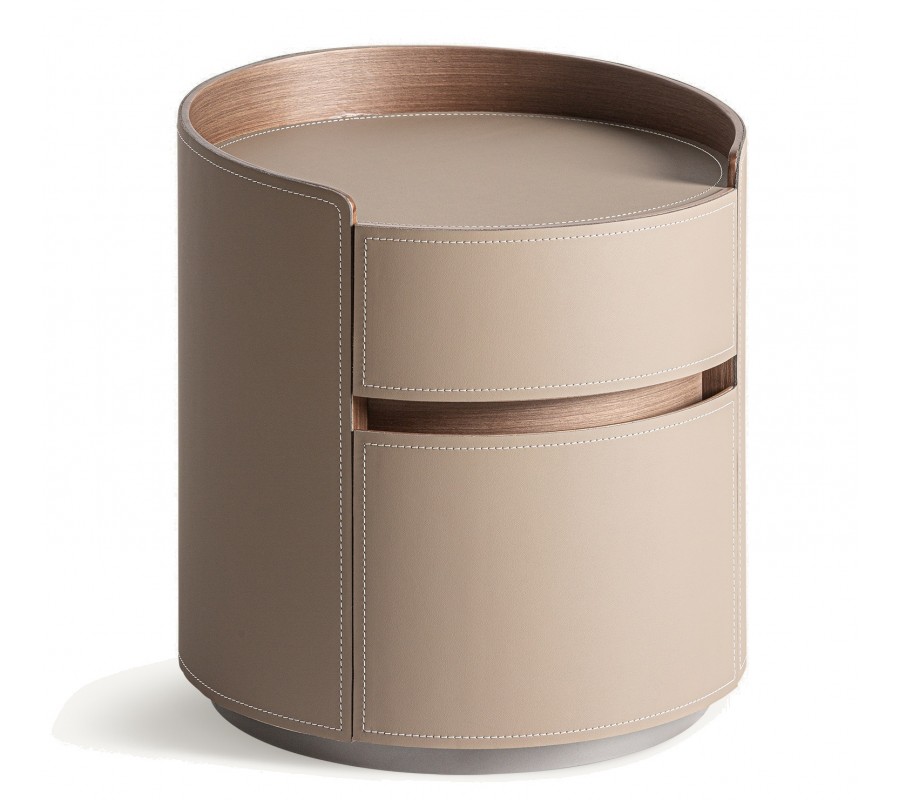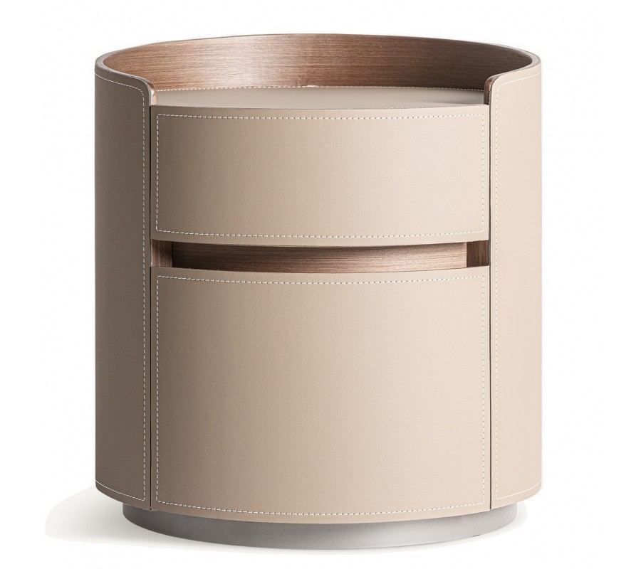 Luxusný kožený okrúhly nočný stolík Kendra s dvomi zásuvkami s béžovým poťahom a hnedými drevenými detailmi 48 cm