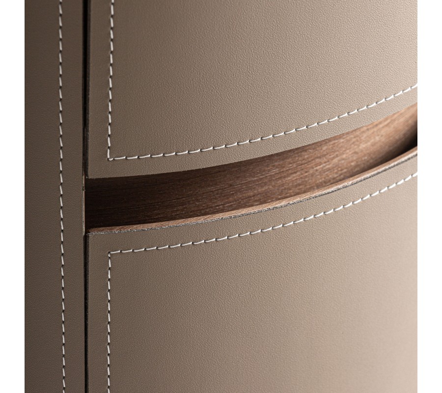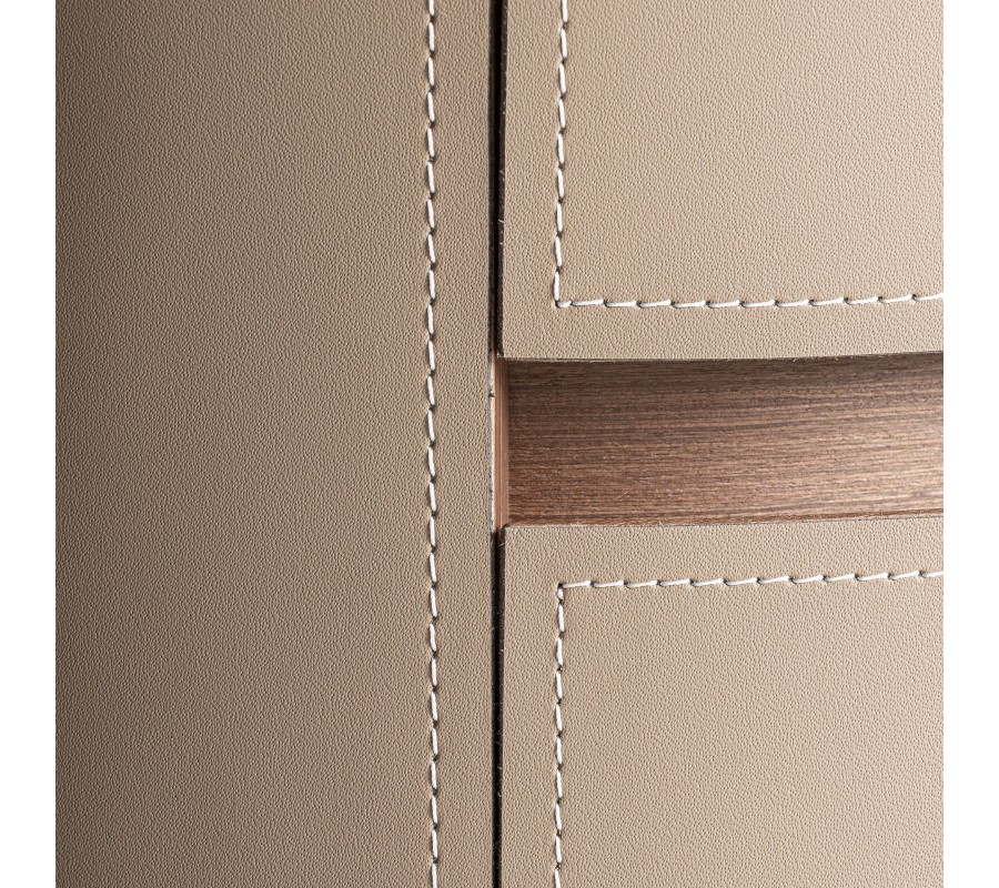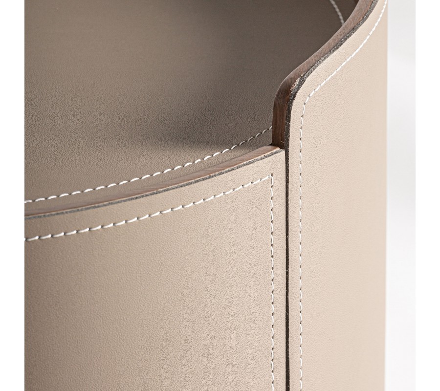 Stolík má okrúhly tvar a jeho hladké povrchy mu dodávajú elegantný minimalistický vzhľad. Telo stolíka je vyrobené z kvalitného dyhovaného dreva v prírodnej teplej hnedej farbe s výraznými líniami letokruhov. Povrch pokrýva poťah z ekokože s hladkým brúseným povrchom v svetlej béžovej farbe. Poťah sa nachádza aj na vrchnej doske a štruktúra kože výborne dopĺňa odhalené drevené detaily medzi zásuvkami a na vyvýšenom okraji vrchnej dosky.