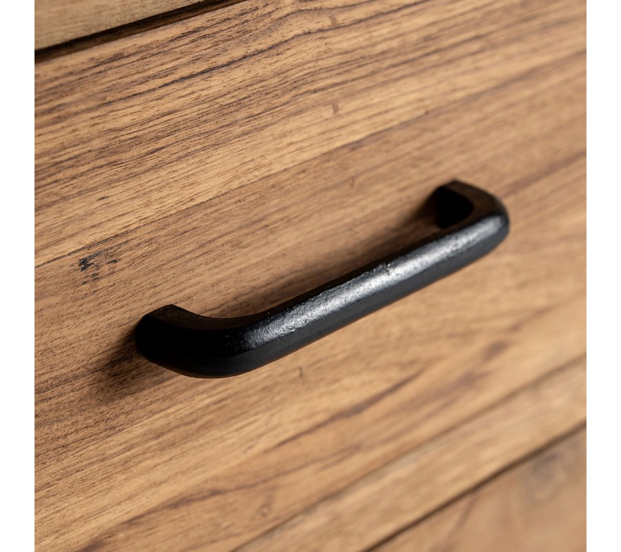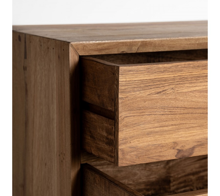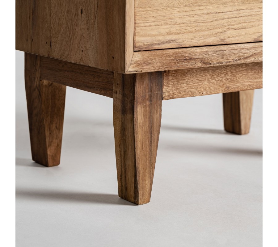 Luxusný vidiecky nočný stolík Trevor v obdĺžnikovom tvare je vyrobený z masívneho recyklovaného dreva v prírodnej hnedej farbe s bohato textúrovanou štruktúrou letokruhov, ktorá podčiarkuje autentický pôvod materiálu a remeselnú kvalitu spracovania. Drevo má jemne zmatnený nelakovaný povrch, ktorý zachováva jeho pôvodný charakter a teplý tón.