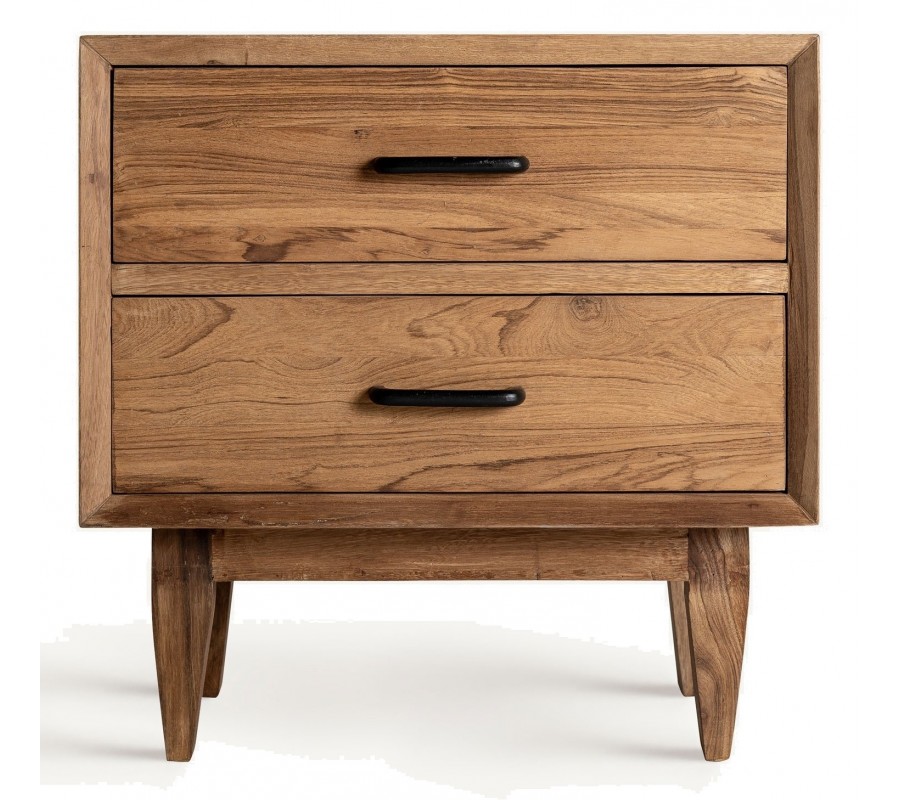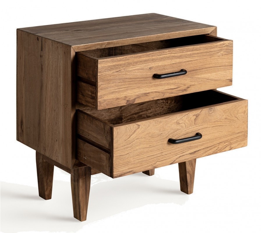 Stolík disponuje dvomi praktickými zásuvkami s elegantnými čiernymi kovovými úchytkami, ktoré vytvárajú decentný kontrast k teplému odtieňu dreva. Celý korpus je pevný a symetrický, no nožičky sú jemne zúžené smerom nadol, hranaté, čím dodávajú stolíku ľahkosť a retro šarm.