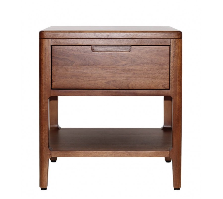 Nočný stolík má minimalistickú siluetu, v ktorej dominujú rovné línie a hladké povrchy. Vrchná doska je obdĺžniková a pod ňou je umiestnená jedna zásuvka. Otvára sa pomocou obdĺžnikového výrezu vo vrchnej časti a toto riešenie úchytky pôsobí vkusným a moderným dojmom. V spodnej časti je umiestnená veľká otvorená polica. Stolík má dlhé štíhle nožičky so zaoblenou vonkajšou hranou, ktorá prechádza po celej výške nábytku. K polici a úložnému priestoru sú taktiež pripojené v subtílnom oblúku. Tieto detaily zjemňujú minimalistický lineárny dizajn a dodávajú mu eleganciu.