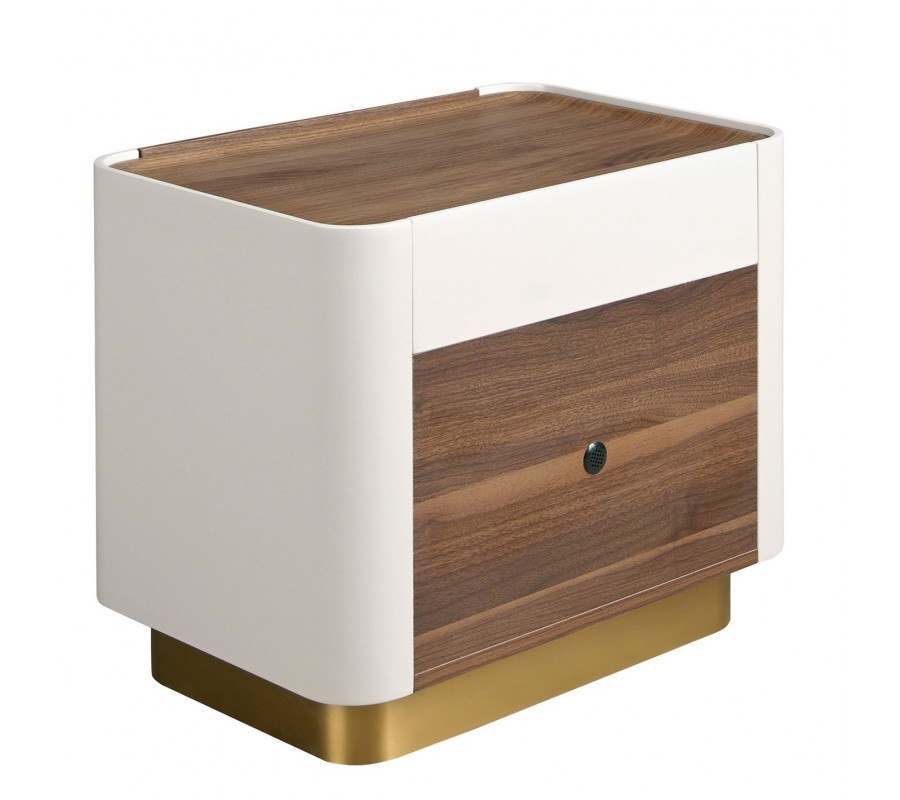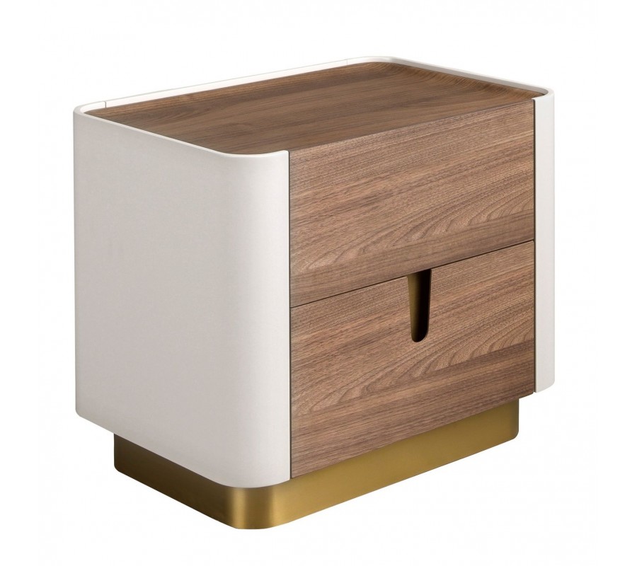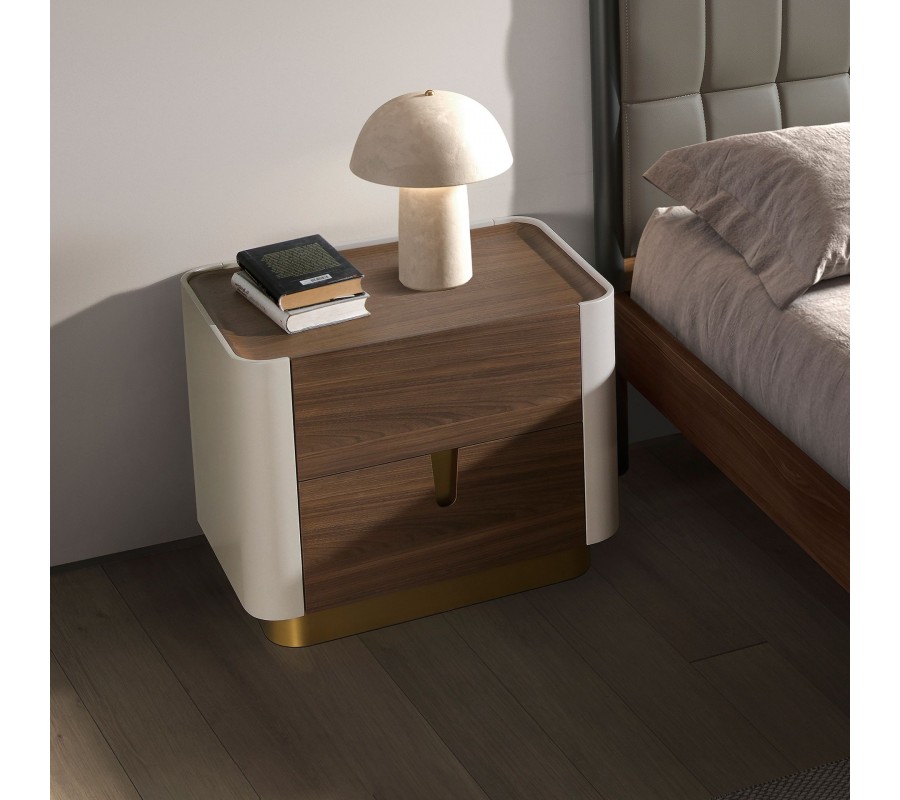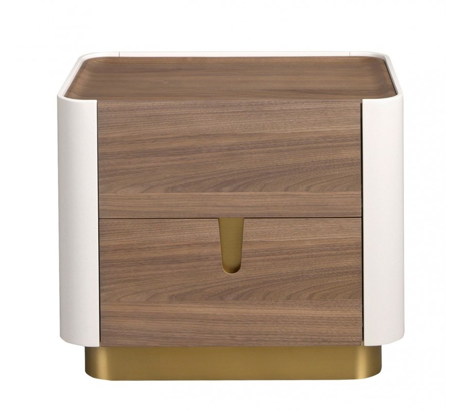 Nočný stolík má obdĺžnikovú siluetu s výrazne zaoblenými vertikálnymi hranami. Je umiestnený na nízkej hranatej podstave z kovu, zatiaľ čo telo je vyrobené z dyhovaného orechového dreva. Poskytne vám bohatý uzavretý úložný priestor v dvoch zásuvkách so soft close systémom pre tiché zatváranie a dodatočnú otvorenú odkladaciu plochu na vrchnej doske s vyvýšenými okrajmi na troch stranách.