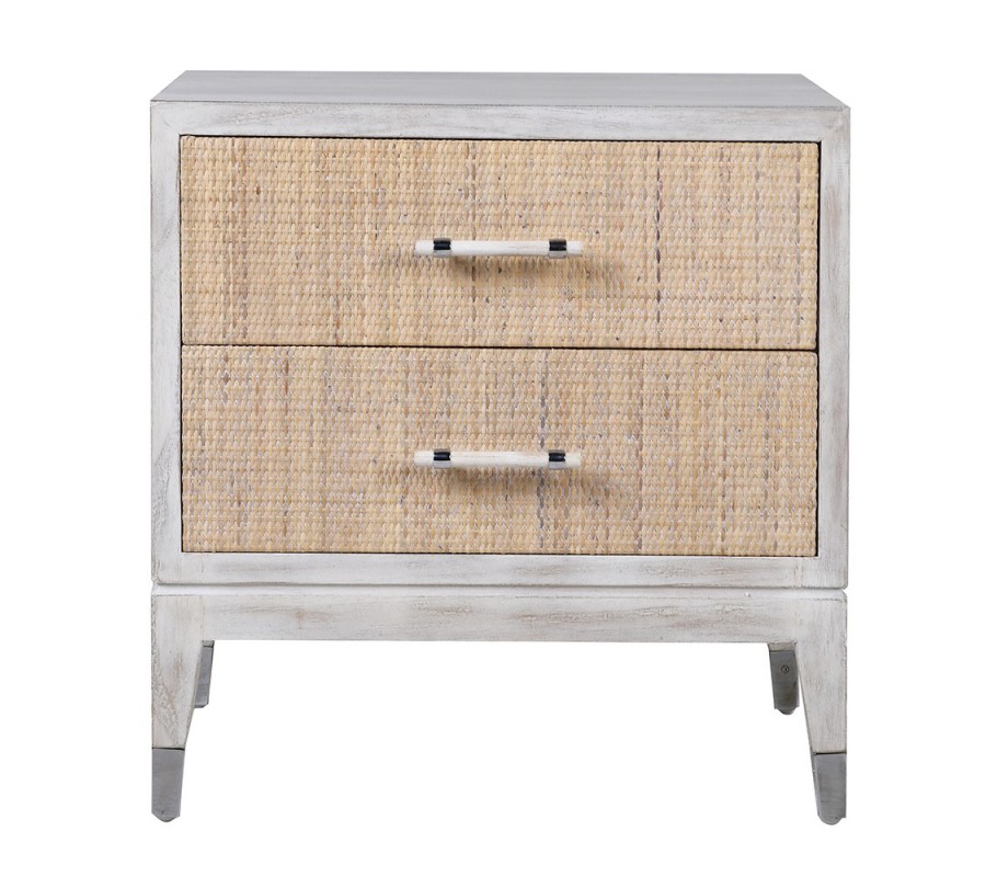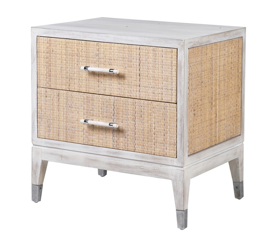 Vrchná doska má obdĺžnikový tvar a na prednej strane sa nachádzajú dve nad sebou umiestnené zásuvky. Ich fasádu a rovnako aj bočné strany stolíka pokrýva hustý ratanový výplet v naturálnej svetlej hnedej farbe. Stolíku dodáva prírodný akcent a zaujímavú štruktúru.