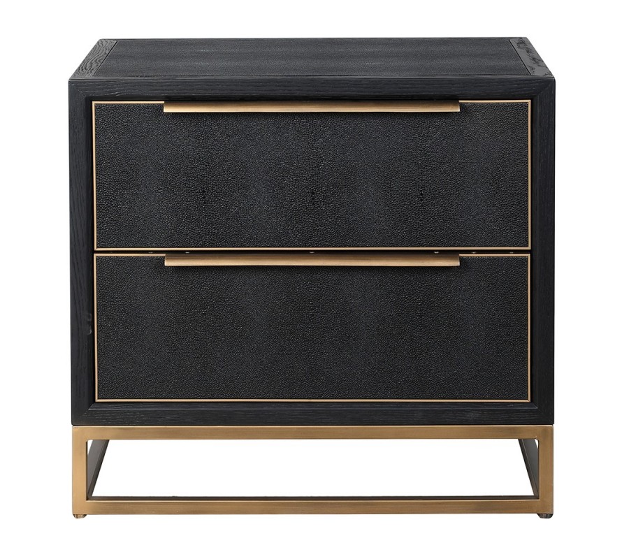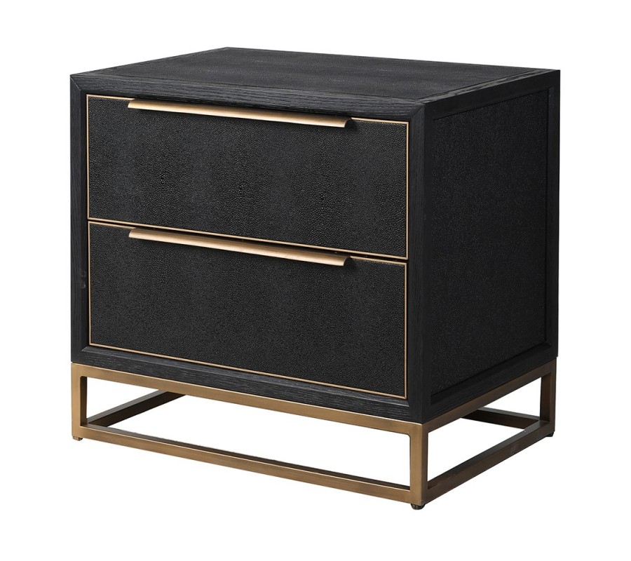 Luxusný art deco obdĺžnikový čierny nočný stolík Millie s dvomi zásuvkami a zlatou kovovou podstavou 66 cm