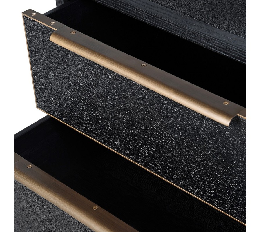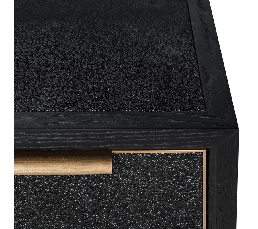 Luxusný nočný stolík Millie v art deco štýle je stelesnením elegancie a sofistikovaného dizajnu. Povrch i bočné strany sú potiahnuté čiernou eko kožou s jemným leskom, ktorá mu dodáva noblesný vzhľad. Konštrukciu tvorí masívne dubové drevo lakované na čierno, ktoré je viditeľné na hranách a elegantne ohraničuje kožené časti, čím zvýrazňuje ich kontrast.