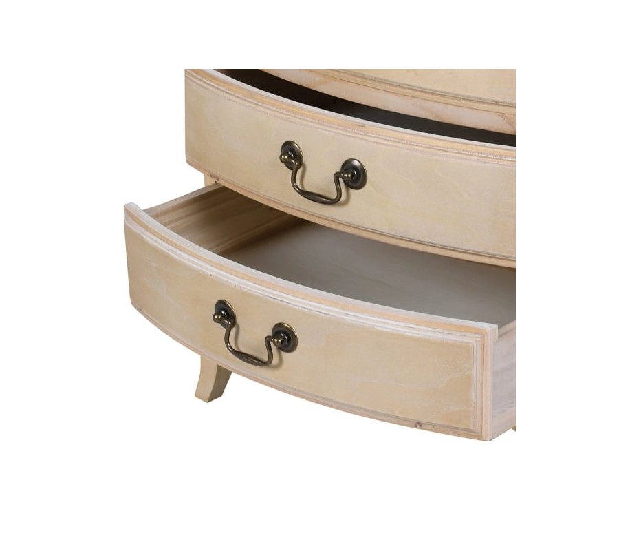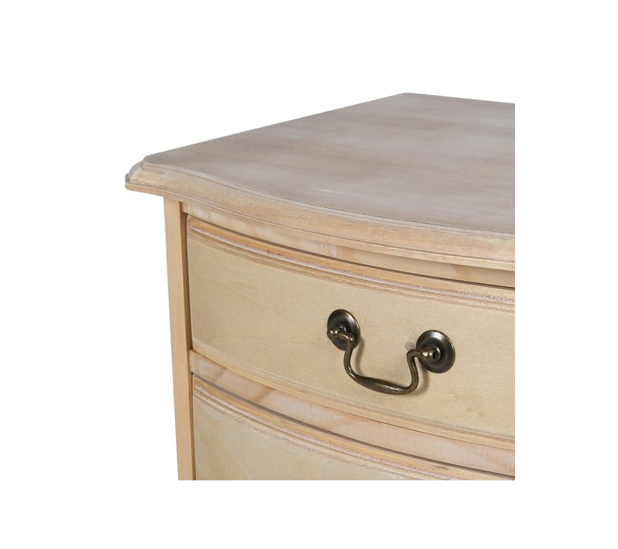 Vrchná doska má jemne vystúpenú a zaoblenú prednú hranu, čo podčiarkuje klasický tvar. Stolík ponúka tri praktické zásuvky, ktoré zdobia visiace kovové úchytky v mosadznej farbe. Tie dodávajú nábytku noblesu a zdôrazňujú jeho tradičný vzhľad.