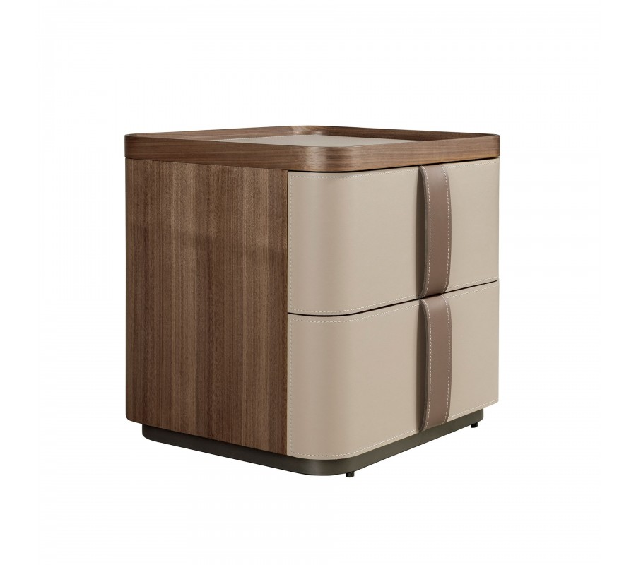 Nočný stolík je vyrobený z kvalitnej orechovej dyhy v naturálnej teplej hnedej farbe. Viditeľná kresba letokruhov podčiarkuje naturálny vizuál a krásne korešponduje s poťahom z pravej kože v béžovej farbe, ktorý prekrýva vrchnú dosku a čelá zásuviek. Výrazné úchytky sú tiež vyrobené z kože, ale v kontrastnej čokoládovej hnedej farbe. Okrem svojej praktickej funkcie poskytujú aj moderný dekoratívny element v podobe zvislého pásu, prechádzajúceho stredom fasády nábytku.