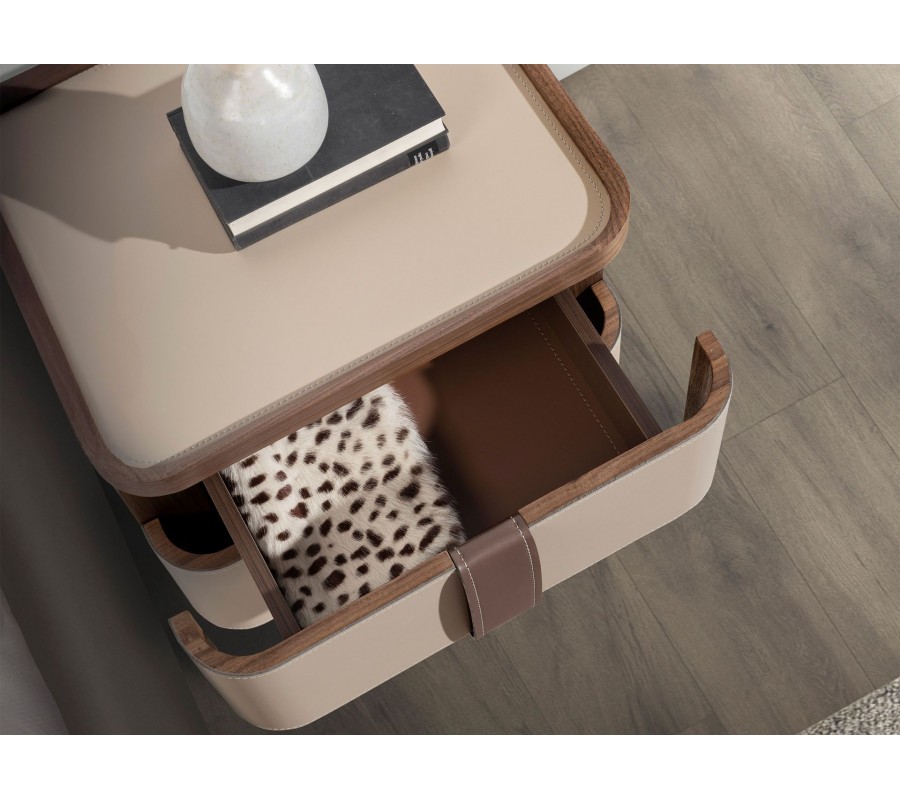Nočný stolík Charmoin prinesie do vašej spálne eleganciu a luxus súčasného talianskeho dizajnu. Spojenie modernej siluety a palety zemitých odtieňov pôsobí sofistikovaným dojmom, zatiaľ čo koža a drevo vytvoria pocit harmónie a tepla.