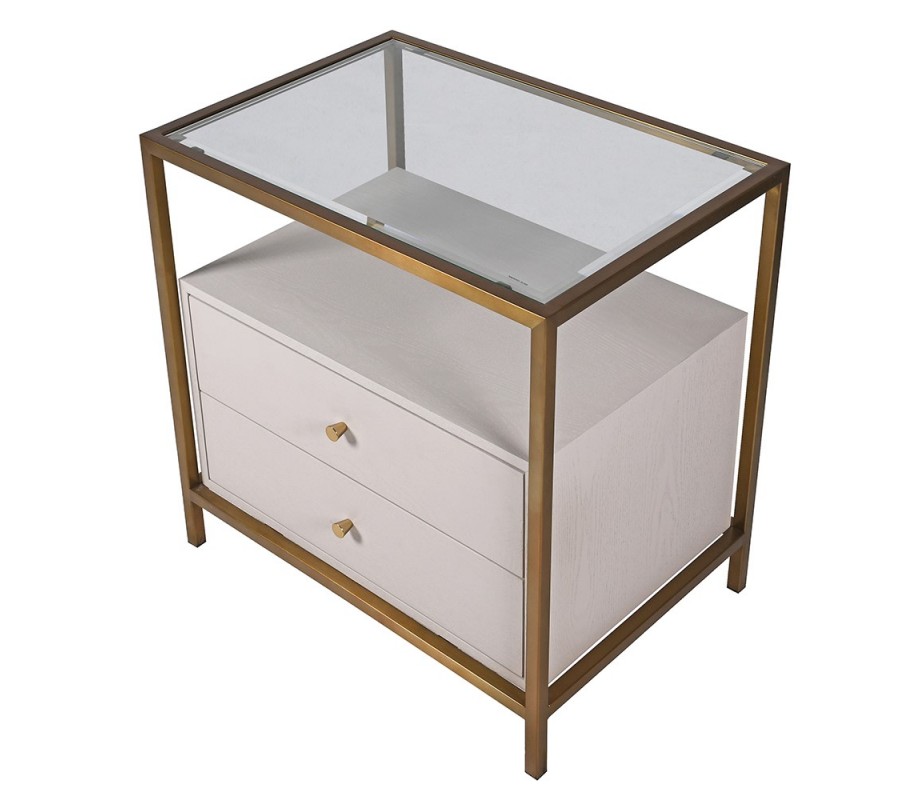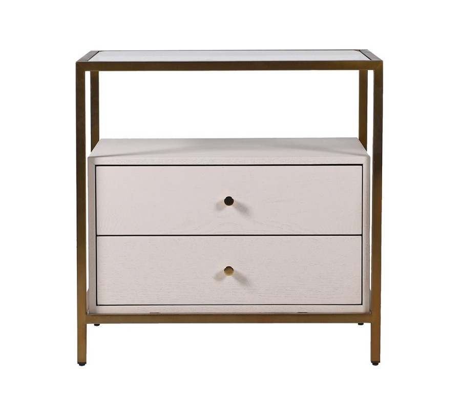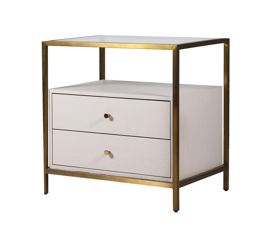 Luxusný art deco krémový nočný stolík Auron so zlatou konštrukciou a sklenenou doskou s dvomi zásuvkami 65 cm