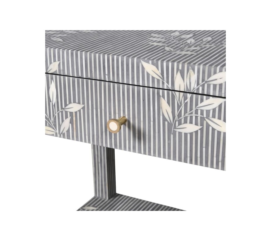 Jemné intarzie z pravých kúskov kosti sú ručne vsádzané do konštrukcie z mangového dreva, lakovaného do elegantného sivého odtieňa. Na povrchu vytvárajú rastlinný motív v podobe listov a vertikálnych prúžkov, ktoré sa pravidelne striedajú a tvoria harmonický kontrast medzi teplým bielym leskom kosti a chladnejšou sivou základňou. Ich perleťový odlesk dodáva stolíku jemnosť a luxusný nádych.