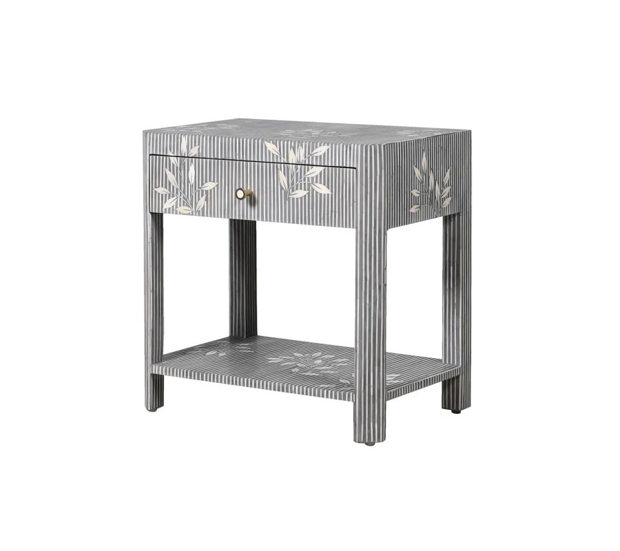 Luxusný vintage nočný stolík Liora s intarziou bone inlay v šedo-bielej farbe s florálnym motívom so zásuvkou a policou 62 cm
