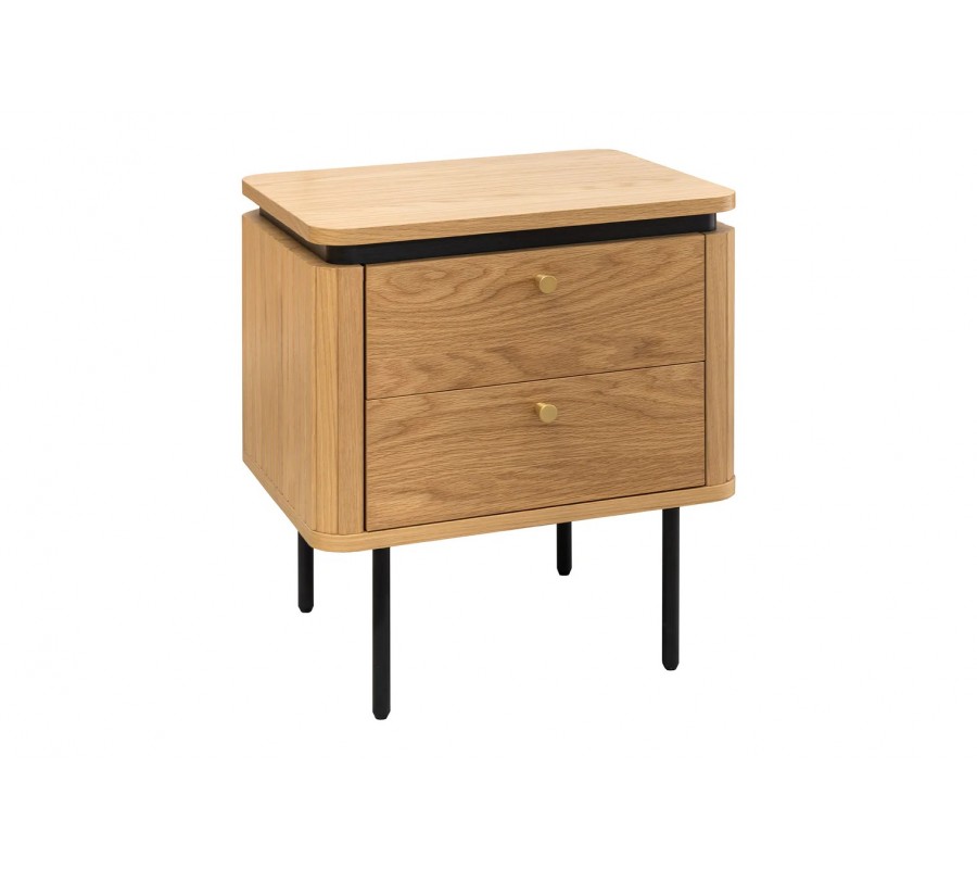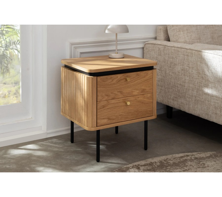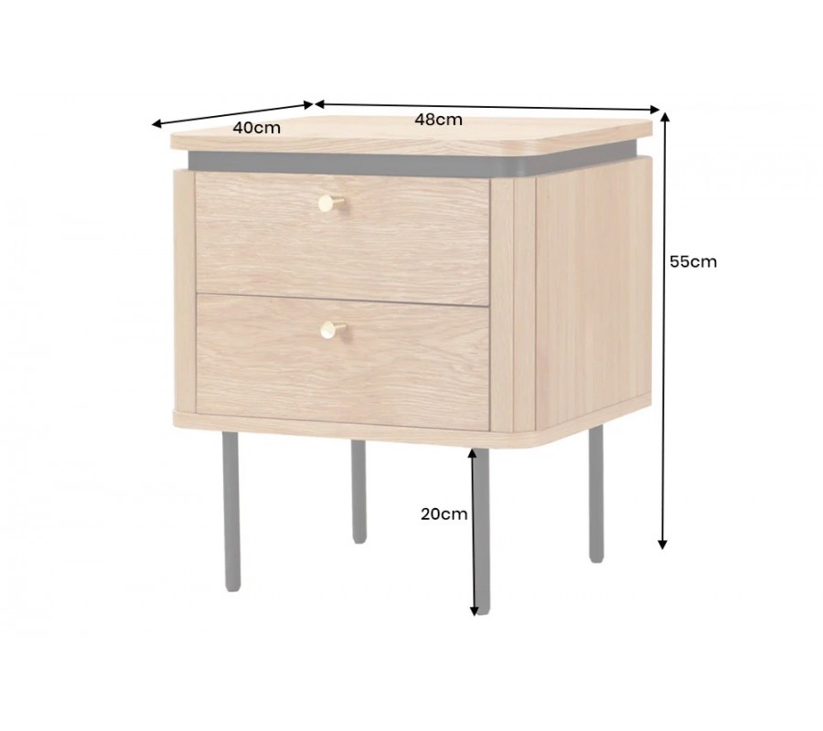 Nočný stolík má obdĺžnikovú vrchnú dosku so zaoblenými rohmi. Pod ňou sa nachádza zúžená lišta s čiernym lakovaním, ktorá vytvára štýlový moderný akcent. Úložný priestor kopíruje tvar vrchnej dosky a pozostáva z dvoch zásuviek, umiestnených nad sebou. Majú hladké čelo s kovovou úchytkou v zlatej farbe, zatiaľ čo ostatné strany stolíka zdobí vertikálny lamelový reliéf.