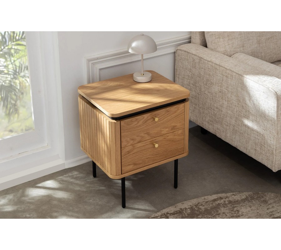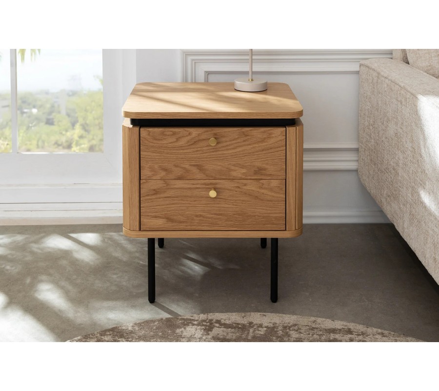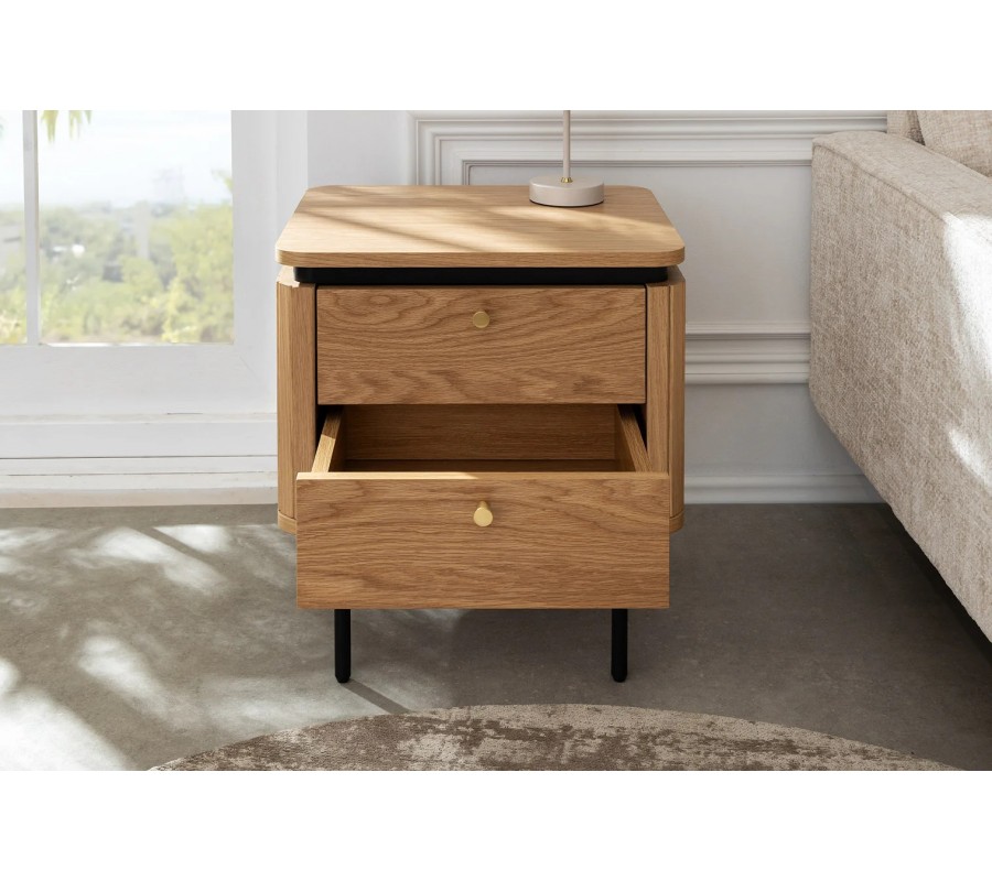 Nočný stolík Maderia bude elegantným doplnkom vašej spálne a vďaka estetickému vizuálu a modernému dizajnu s nádychom art deco štýlu sa uplatní aj ako príručný stolík v obývačke. Dubové drevo prinesie do miestnosti pocit tepla a oceníte aj bohatý úložný priestor.
