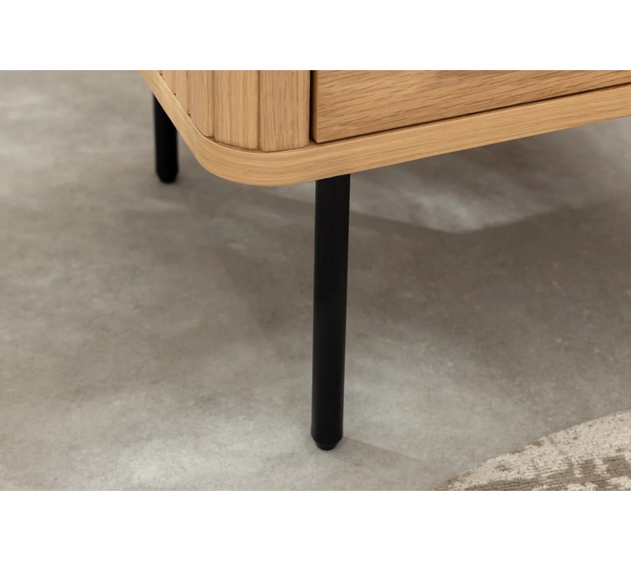 Úložný priestor je vyrobený z dubovej dyhy v naturálnej svetlej hnedej farbe s jemnou pravidelnou kresbou letokruhov. Čierny lakovaný detail dopĺňajú tmavé matné kovové nožičky. Ich štíhly tvar vyvažuje mohutnú vrchnú časť a nábytok tak pôsobí odľahčene.