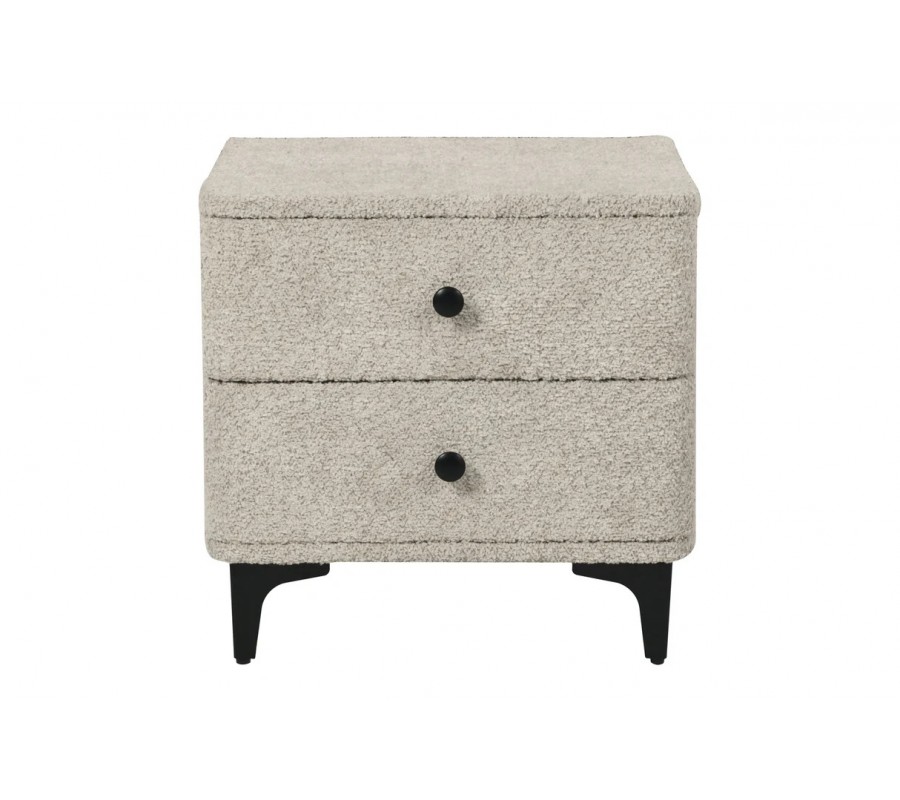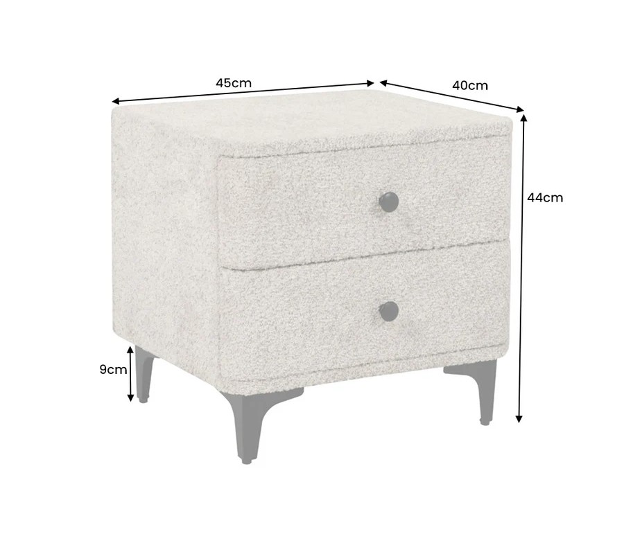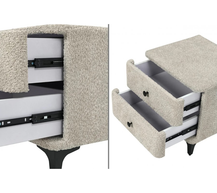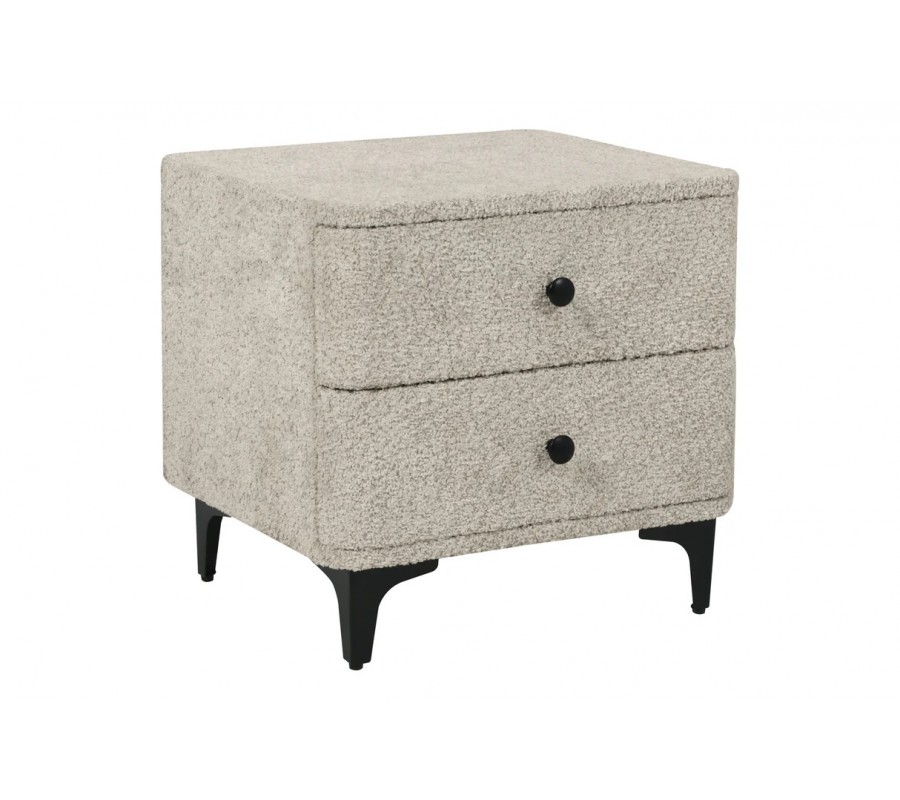 Dizajnový buklé nočný stolík Lanc v art deco štýle zaujme na prvý pohľad svojím moderným prevedením. Jeho povrch má výraznú, hustú textúru typickú pre buklé, čo dodáva stolíku príjemný, nadýchaný charakter. Telo stolíka má štvorcový tvar so zaoblenými rohmi a je kompletne potiahnutý látkou v sivom odtieni, ktorá pôsobí jemne a útulne na pohľad aj dotyk.