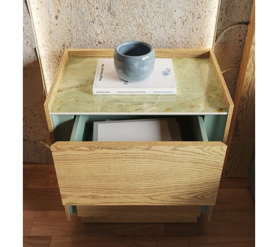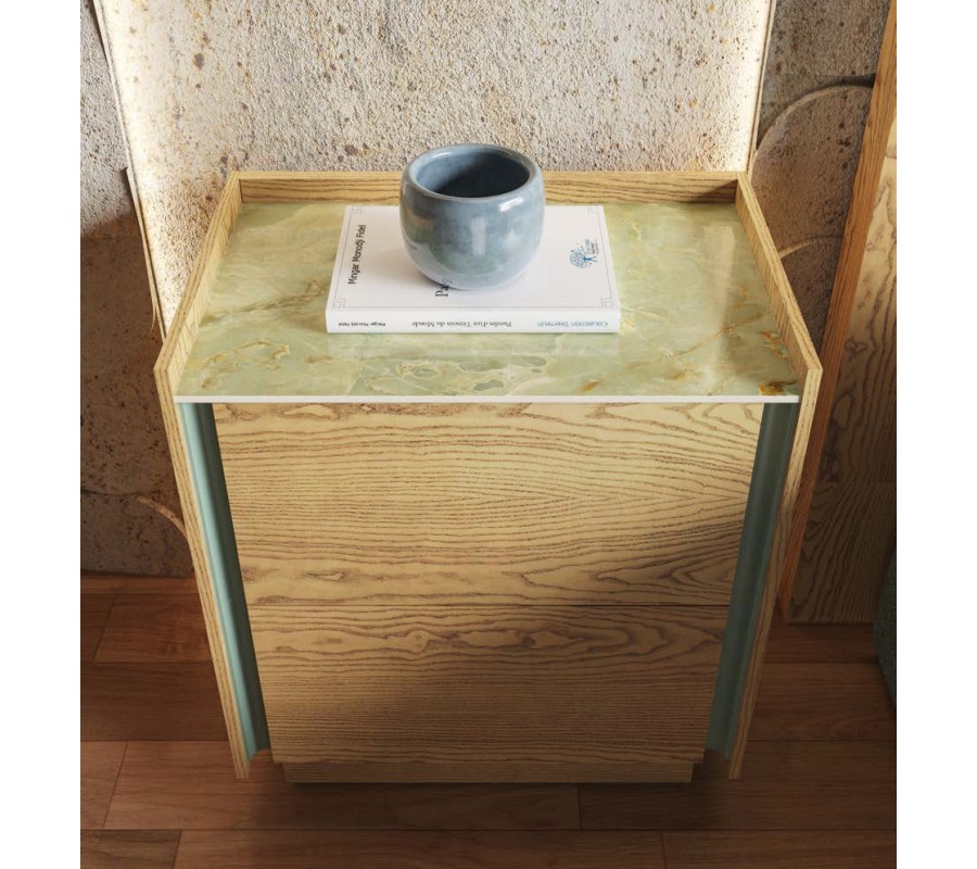 Stolík disponuje dvomi zásuvkami, ktoré sú po stranách mierne odsadené od bočných stien. Vzniknuté jemné medzery slúžia ako integrovaný spôsob otvárania bez potreby klasických úchytiek, čím zostáva celkový dizajn čistý a nerušený.