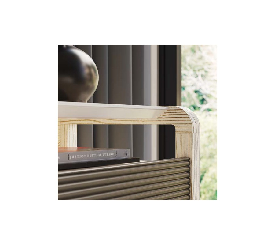 Luxusný moderný nočný stolík Berna je dizajnový kúsok, ktorý spája jemnú architektúru tvarov s precíznymi detailmi. Obdĺžniková silueta je rámovaná oblými bočnými nohami vytvorenými z ohýbaných tenkých dosiek, ktoré po celej bočnej strane vytvárajú mäkkú líniu bez plného korpusu, čím stolík pôsobí ľahko a vzdušne.