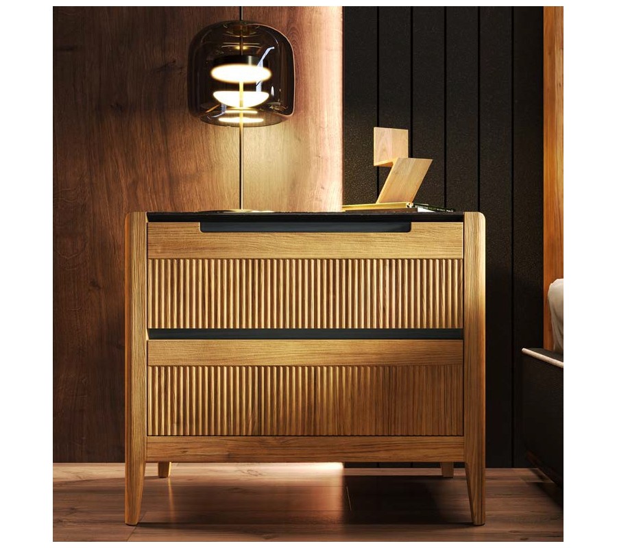 Luxusný moderný nočný stolík Tallin je výrazným dizajnovým prvkom spálne, ktorý kombinuje čisté línie s dekoratívnou štruktúrou a praktickým úložným priestorom. Obdĺžnikové telo so zaoblenými hranami pôsobí harmonicky a podčiarkuje moderný, architektonicky vyvážený charakter nábytku.