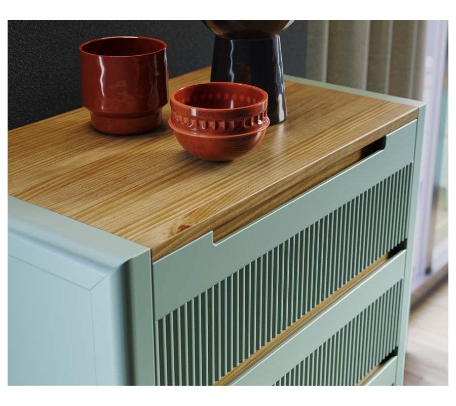 Stolík disponuje dvomi zásuvkami, ktorých čelné plochy zdobí typické vertikálne vrúbkovanie kolekcie Tallin. Otváranie je riešené pomocou integrovaných vyrezaných úchytiek v hornej časti, vďaka čomu zostáva dizajn nerušený a vizuálne kompaktný.
