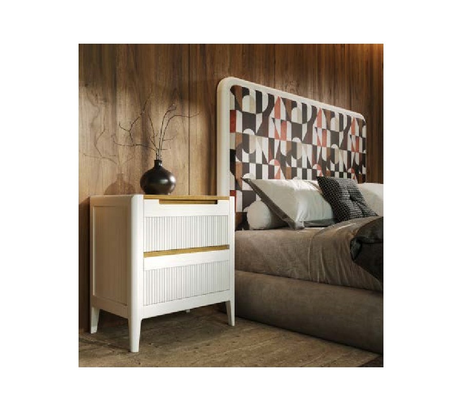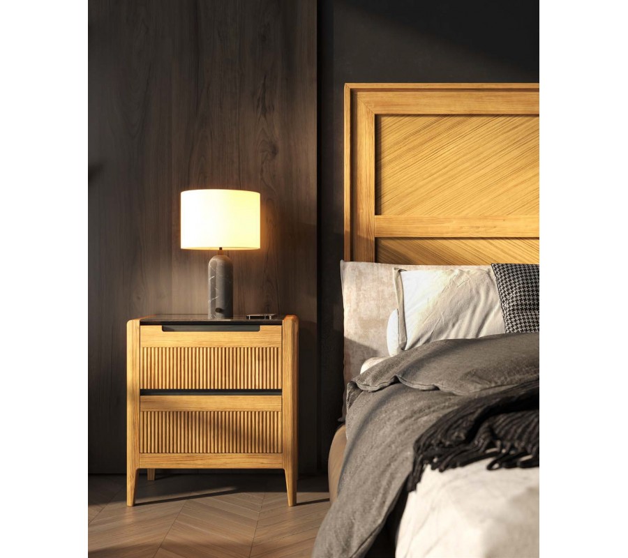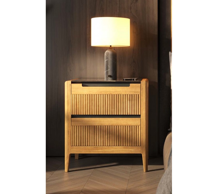 Stolík disponuje dvomi zásuvkami, ktorých predné plochy sú spracované vertikálnym vrúbkovaním, typickým dizajnovým znakom kolekcie Tallin. Otváranie je riešené integrovanými vyrezanými úchytkami v hornej časti zásuviek, vďaka čomu zostáva celkový vzhľad čistý a bez rušivých prvkov.