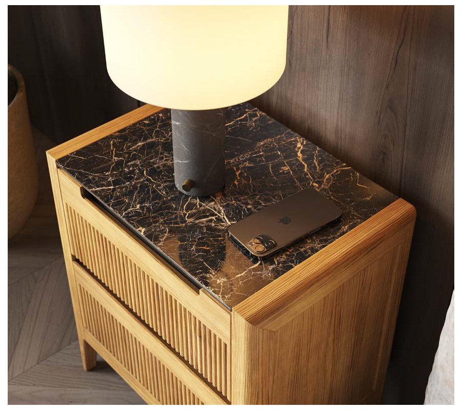 Vrchnú dosku je možné vyhotoviť v drevenom alebo mramorovom dizajne podľa výberu zákazníka, čím sa dá výrazne ovplyvniť charakter celého kusu. Nočný stolík stojí na nízkych úzkych nožičkách, ktoré mu dodávajú ľahkosť a vizuálnu eleganciu.