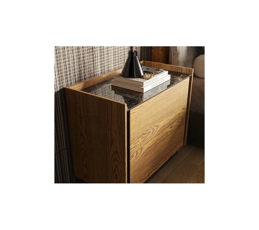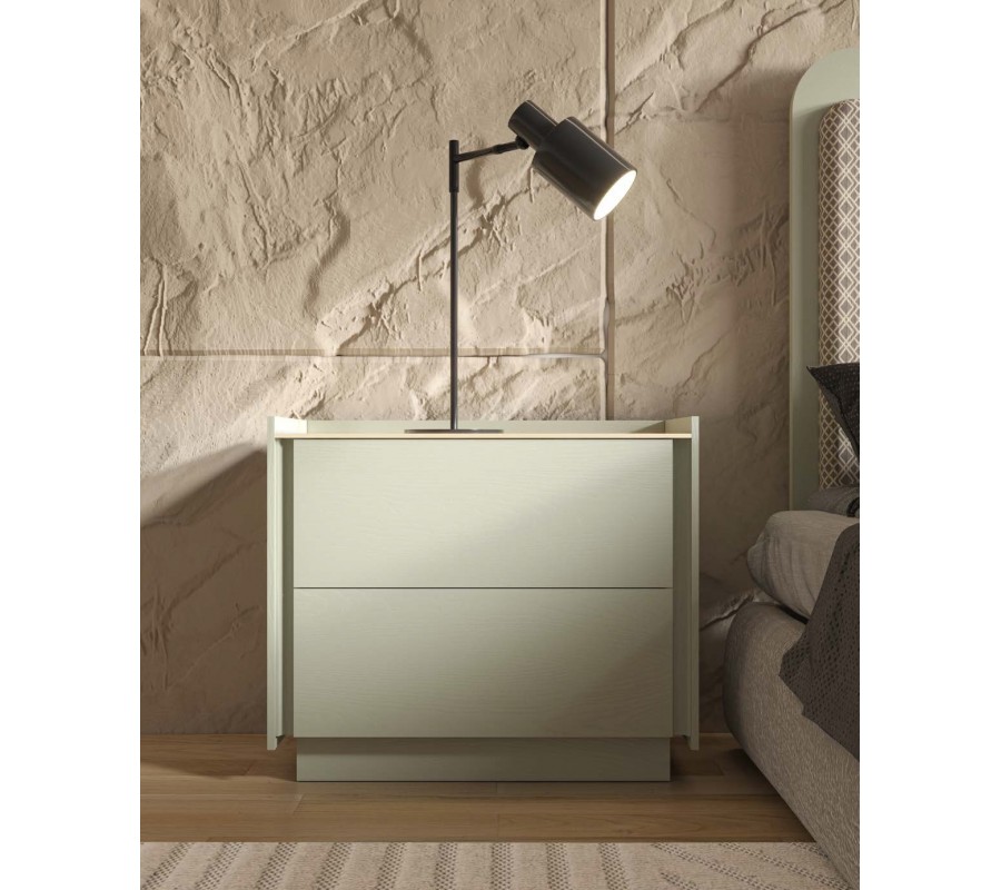 Úložný priestor tvoria dve zásuvky bez viditeľných čelných úchytiek. Otváranie je riešené bočnými úchytovými medzerami, ktoré vytvárajú jemný dizajnový detail a zároveň zachovávajú hladký a minimalistický vzhľad prednej plochy. Vrchná doska je po bočných a zadnej strane doplnená o vyvýšené hrany, ktoré prakticky bránia skĺznutiu odkladaných predmetov a zvyšujú komfort každodenného používania.