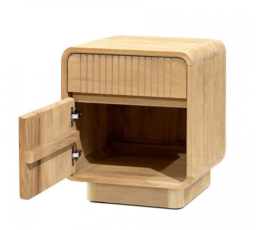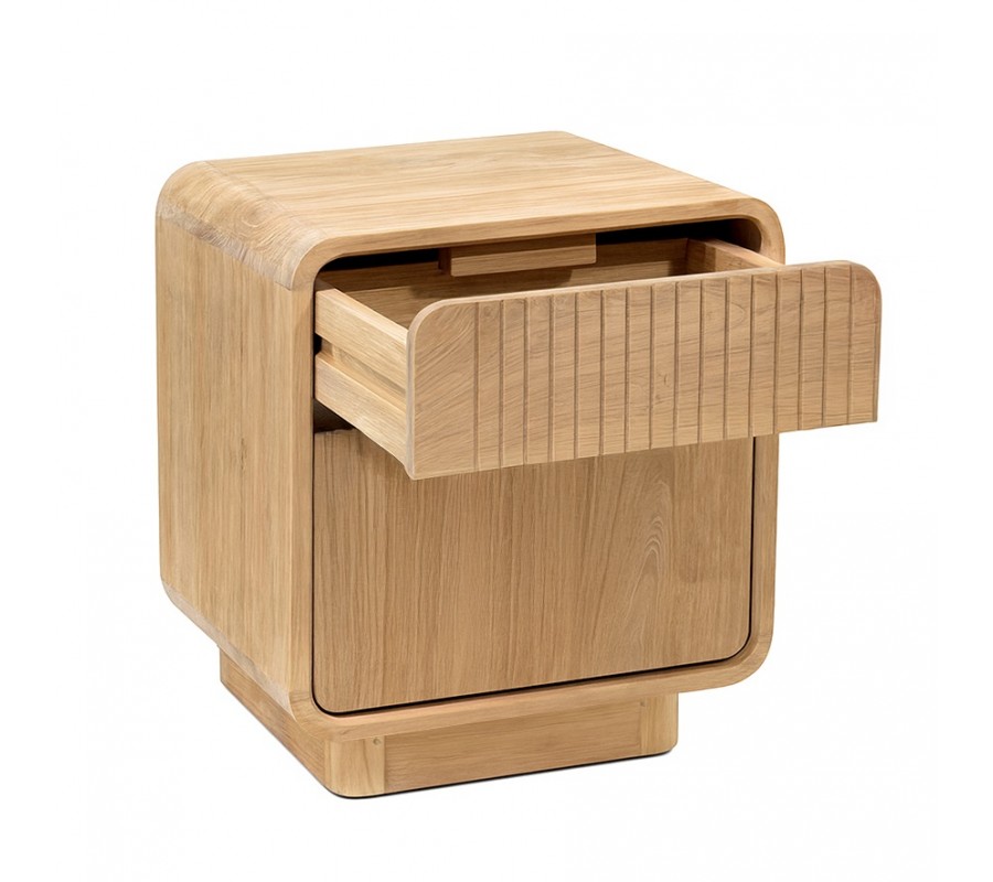 Nočný stolík je vyrobený z masívneho teakového dreva, ktoré mu prepožičiava svoju naturálnu svetlú hnedú farbu s estetickou kresbou letokruhov. Pôsobí teplým prírodným dojmom a tento materiál sa zároveň vyznačuje aj vysokou pevnosťou a odolnosťou. Remeselné ručné spracovanie kladie veľký dôraz a detaily a dodáva nábytku luxusný charakter.