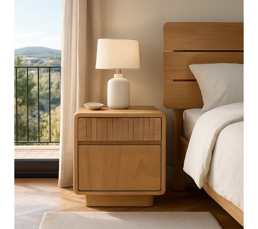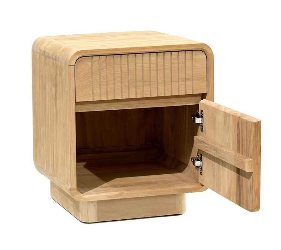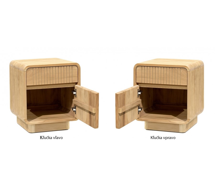Nočný stolík má nízku plnú podstavu. Na nej je umiestnený úložný priestor, ktorý ju mierne presahuje. V spodnej časti sa nachádza jednodverová skrinka, ktorú hore dopĺňa jedna zásuvka. Dizajn bez úchytiek pôsobí minimalistickým moderným dojmom. Fasádu zásuvky zdobí vyrezávaný vertikálny lineárny reliéf, ktorý výborne korešponduje s geometrickou siluetou. Čisté rovné tvary dopĺňajú elegantné zaoblenia na rohoch, inšpirované retro dizajnom tzv. waterfall nábytku, populárneho v 20. rokoch minulého storočia.