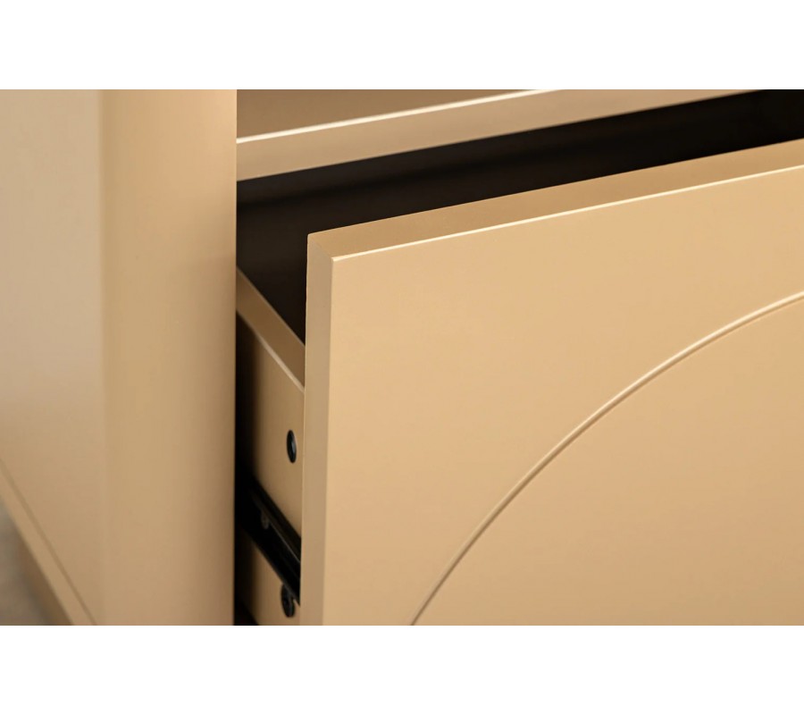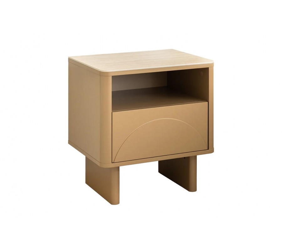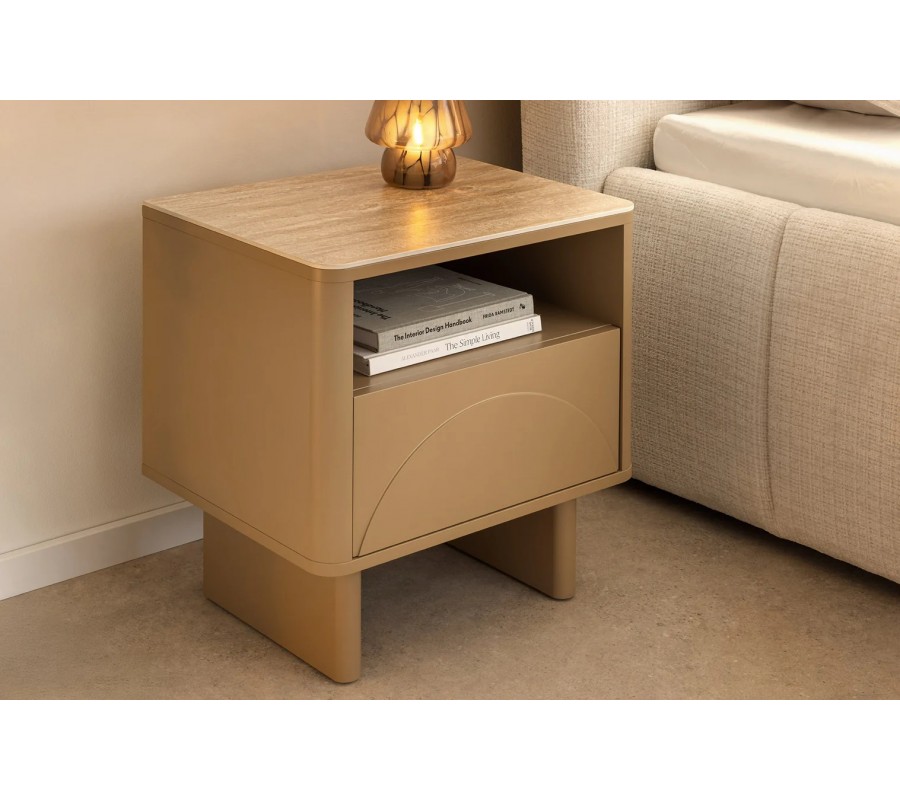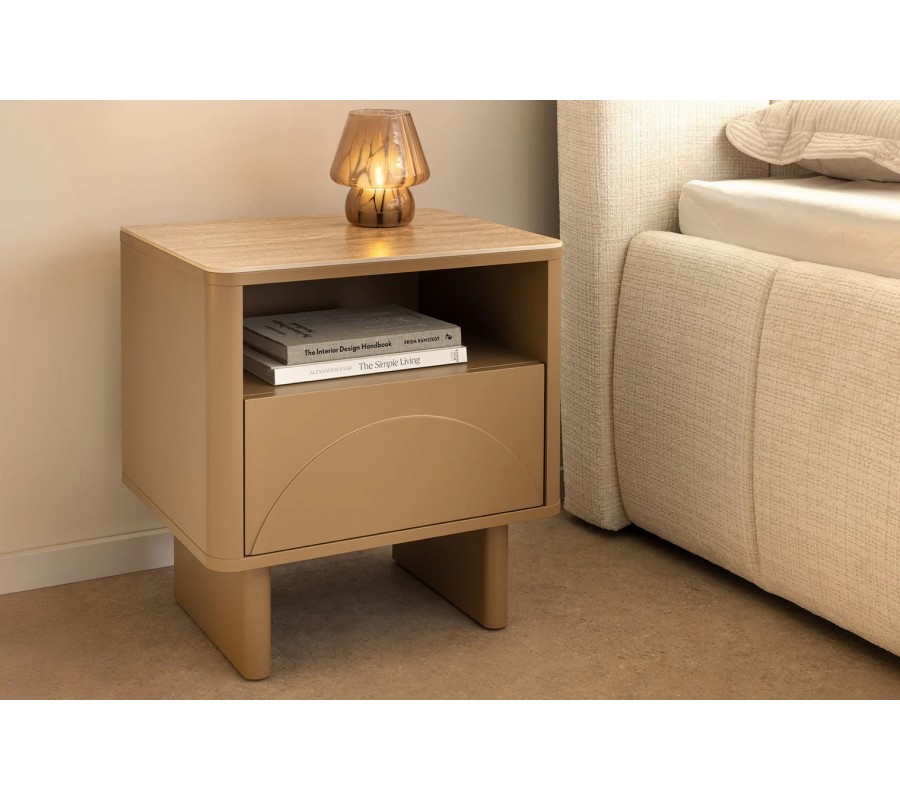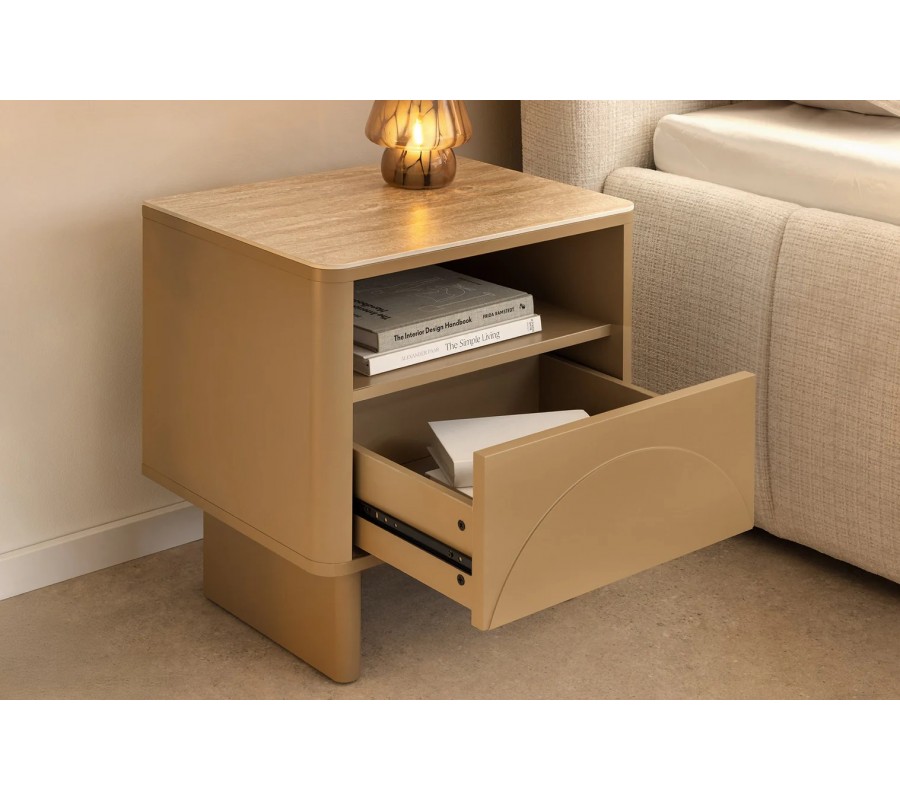 Telo stolíka má tiež zaoblené rohy, čo prináša do moderného dizajnu eleganciu. Je vyrobené z kvalitnej dyhy v príjemnom svetlom hnedom lakovaní, ktoré krásne korešponduje so vzhľadom travertínu. Vo vrchnej časti sa nachádza polica s otvorenou prednou stranou a pod ňou je umiestnená jedna zásuvka. Jej fasádu bez úchytky zdobí geometrický reliéf v podobe poloblúka, inšpirovaný art deco estetikou.