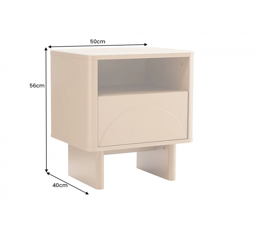 Nočný stolík má obdĺžnikovú vrchnú dosku so zaoblenými rohmi s naturálnym travertínovým dizajnom v béžových odtieňoch. Je vyrobená z keramiky, čo jej zaručuje výbornú pevnosť, odolnosť a nenáročnú údržbu.