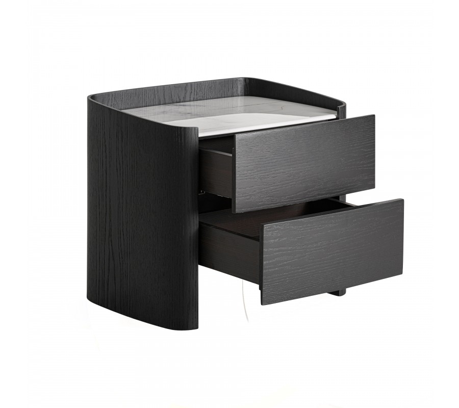 Luxusný nočný stolík Kugart zaujme čistou architektonickou siluetou a elegantným kontrastom tmavého dreva a svetlej kamennej dosky. Povrch stolíka je vyhotovený v čiernej dubovej dyhe, ktorej výrazná kresba letokruhov dodáva nábytku prirodzenú textúru a vizuálnu hĺbku.