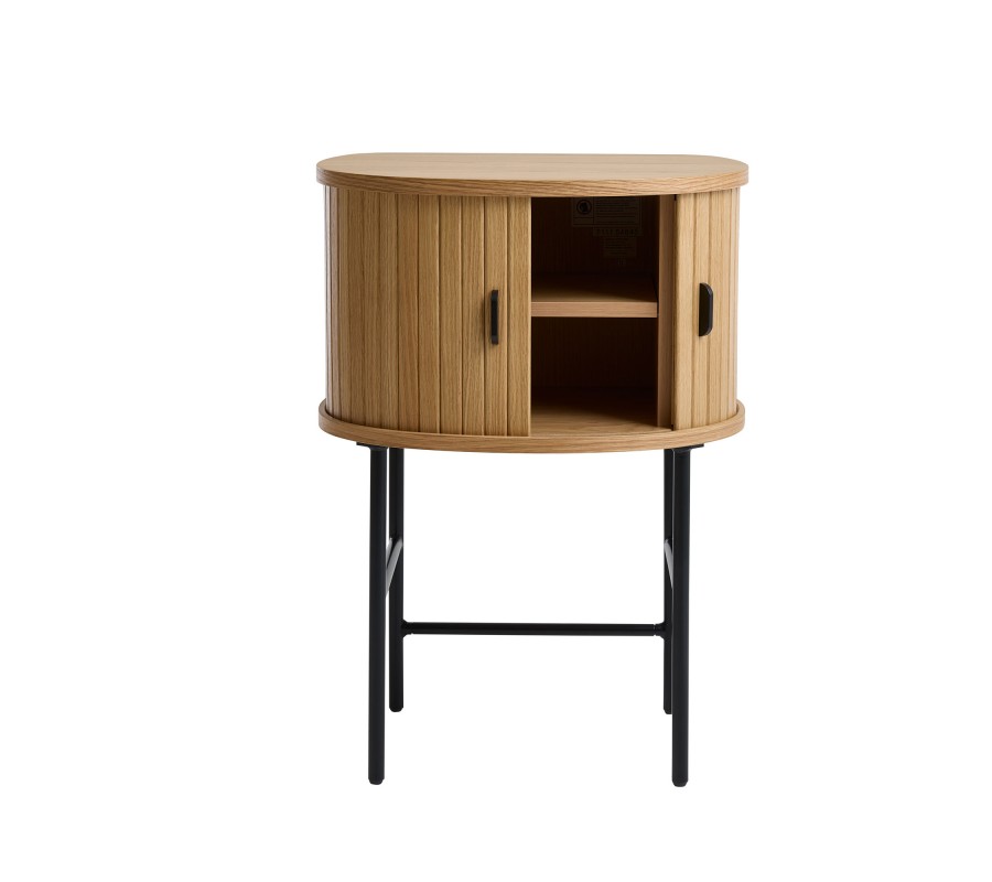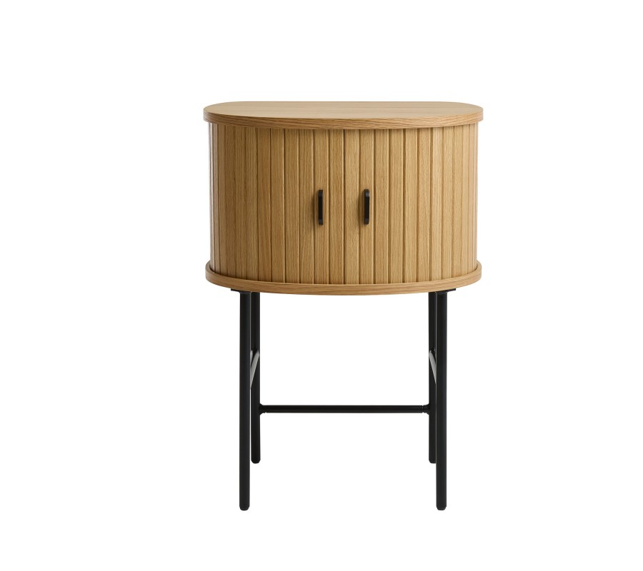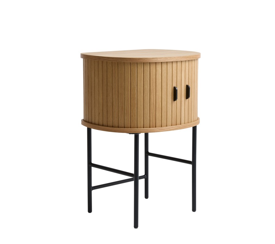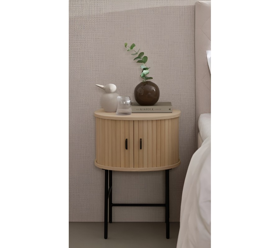 Nočný stolík disponuje vrchnou doskou v polkruhovom tvare, so zarovnanou zadnou hranou a zaoblenou prednou časťou. Hladký povrch zvýrazňuje prirodzenú kresbu dreva, ktorá dodáva nábytku prírodný charakter. Pod doskou sa nachádza úložný priestor uzatvárateľný dvojicou posuvných dvierok s vertikálnym lamelovým dekorom, inšpirovaným retro štýlom. Dvierka dopĺňajú dve zvislé zaoblené úchytky. Vnútorný priestor je rozdelený na dve police umiestnené nad sebou.