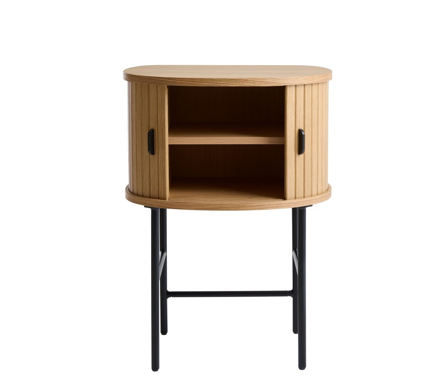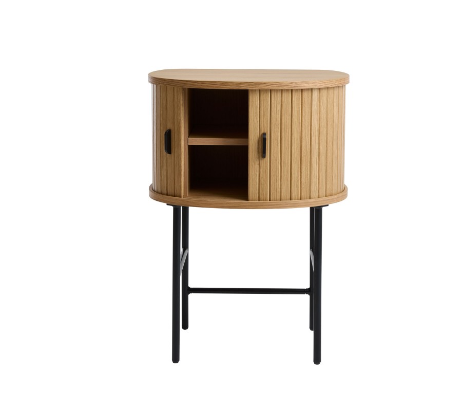 Škandinávsky nočný stolík Bornholm v svetlom hnedom dubovom prevedení s posuvnými dvierkami a čiernymi kovovými nohami 70 cm