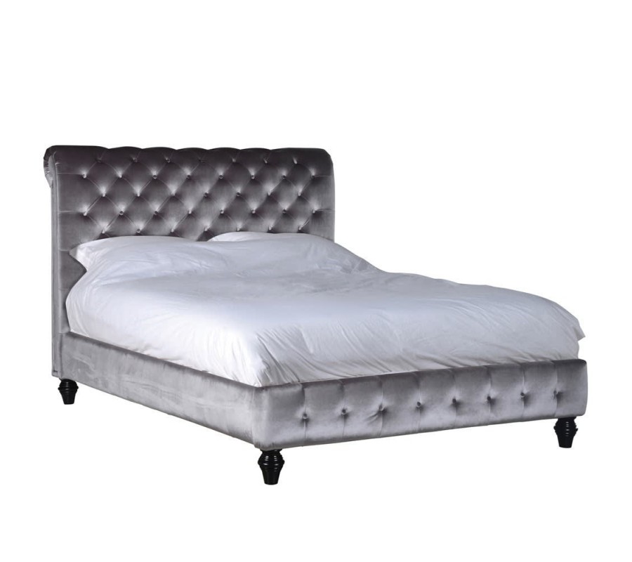 Luxusná sivá posteľ Alcala II s Chesterfield prešívaním na zamatovom poťahu s ozdobnými drevenými nohami 170cm