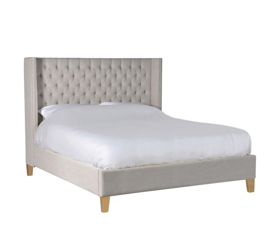 Luxusná béžová Chesterfield posteľ Heidy s ľanovým poťahom a bledými drevenými nohami 194cm