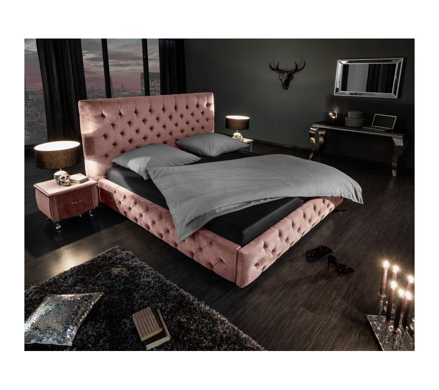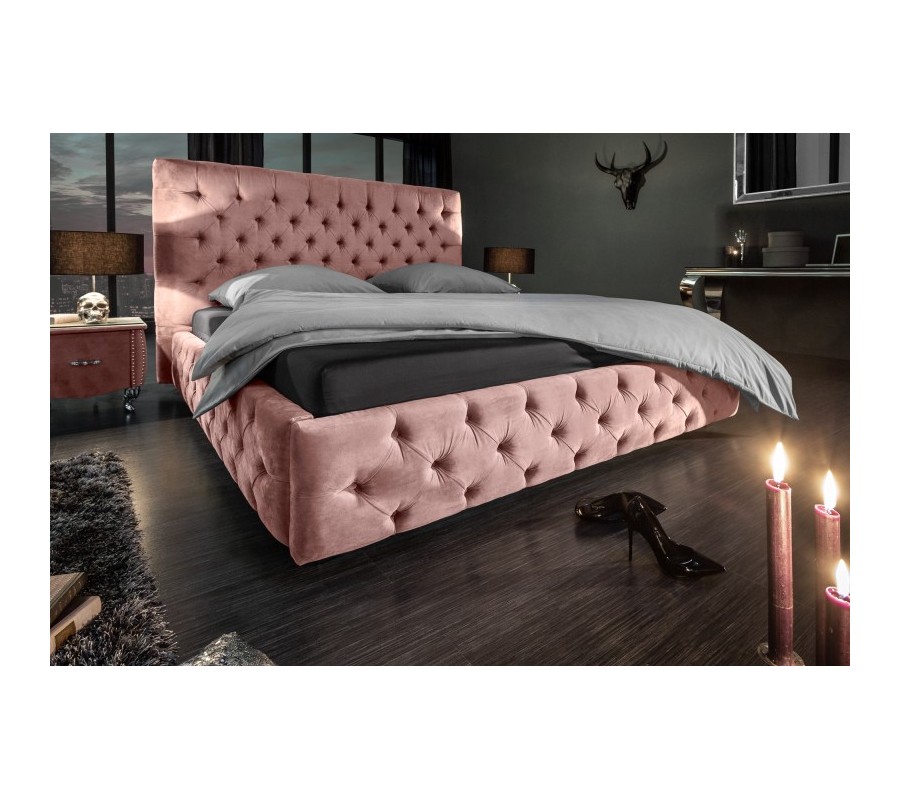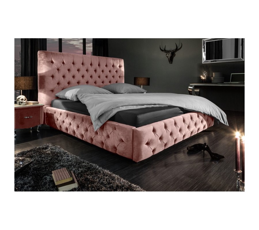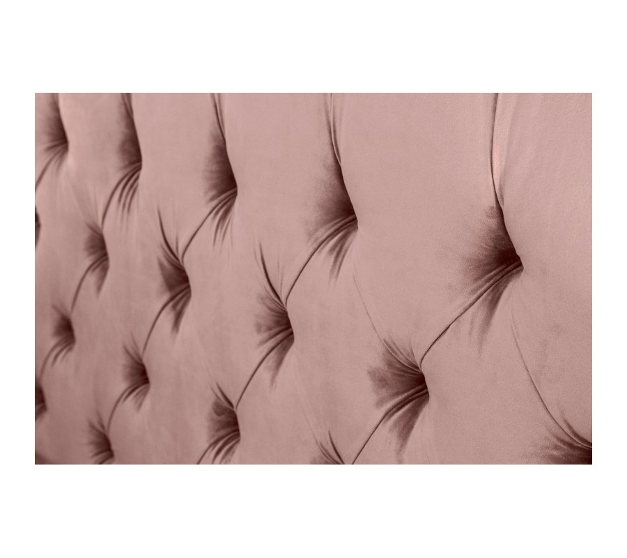 Chesterfield ružová čalúnená posteľ Kreon III so zamatovým poťahom a vysokým čelom